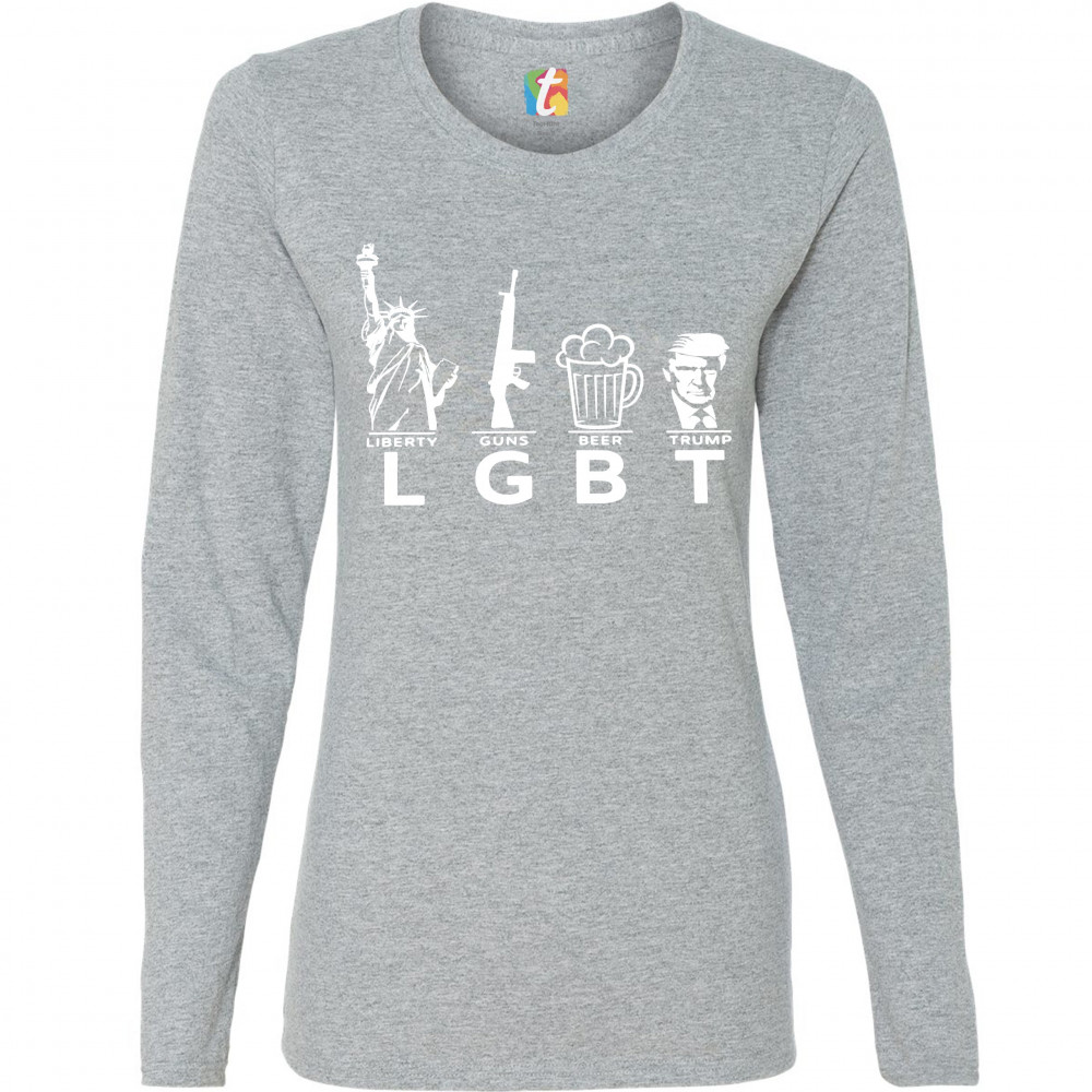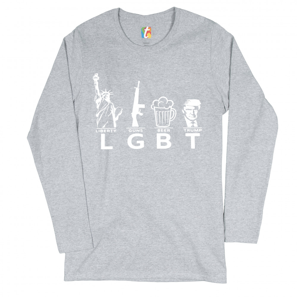 A funny political print featuring big letters LGBT, which stand for "Liberty, Guns, Beer and Trump". Above each word there are an underlined images of the Statue of Liberty, a rifle, a glass of beer and a picture of Donald Trump respectively. A great choi