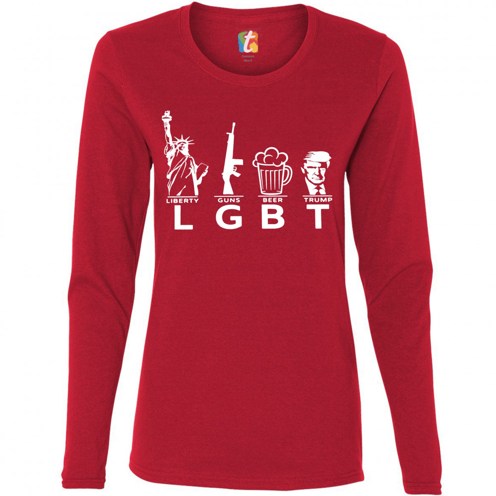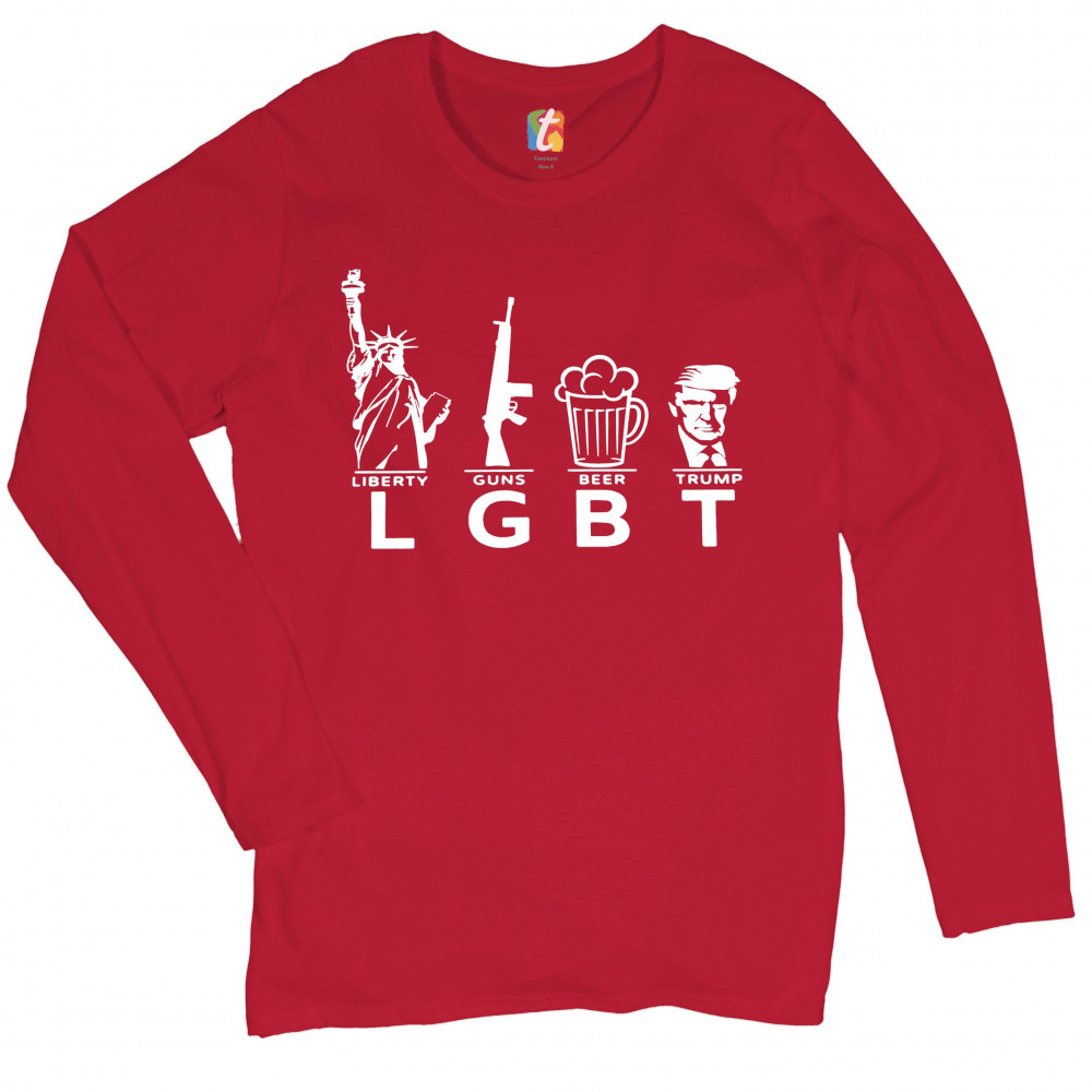 A funny political print featuring big letters LGBT, which stand for "Liberty, Guns, Beer and Trump". Above each word there are an underlined images of the Statue of Liberty, a rifle, a glass of beer and a picture of Donald Trump respectively. A great choi