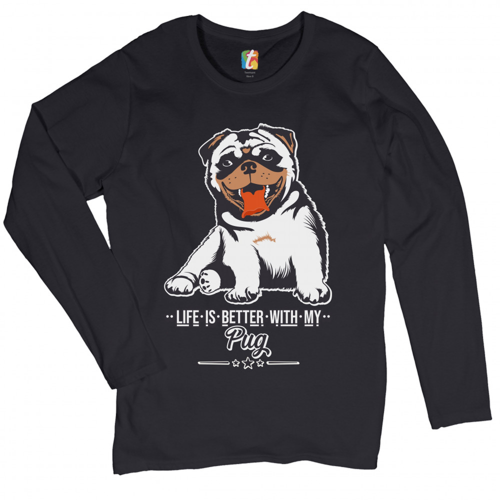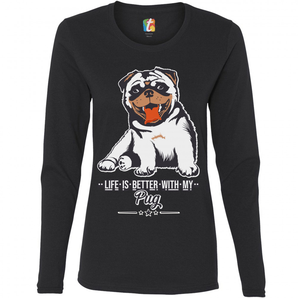 LIFE IS BETTER WITH MY PUG women's long sleeve t-shirt cute pet adorable dog black