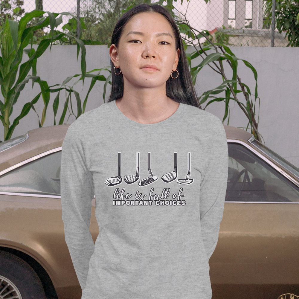 LIFE IS FULL OF IMPORTANT CHOICES women's long sleeve t-shirt funny golf clubs gray