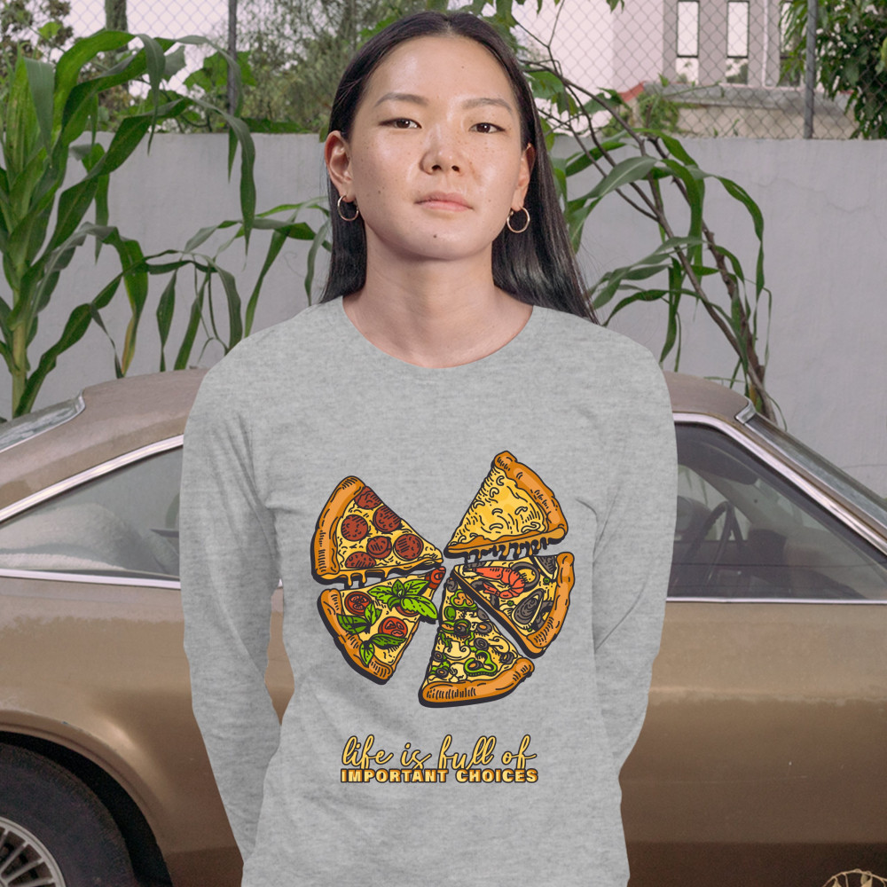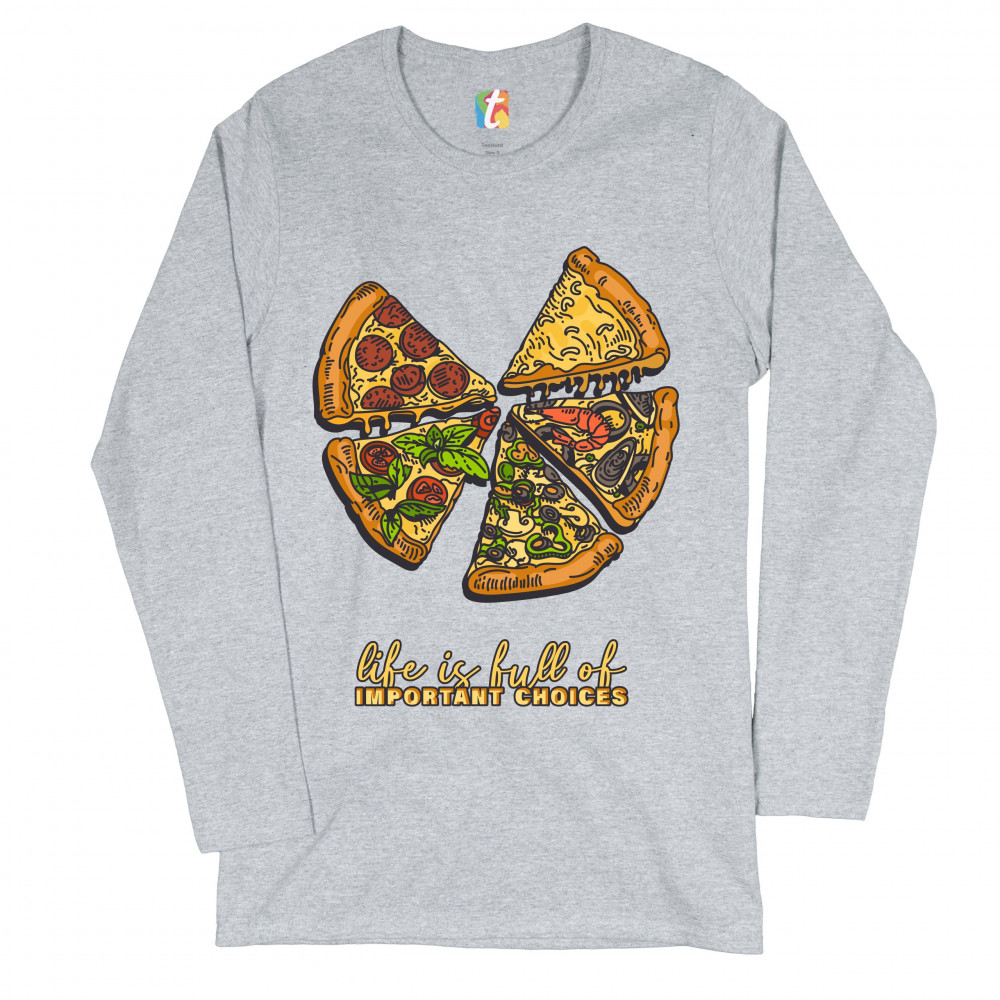 LIFE IS FULL OF IMPORTANT CHOICES women's long sleeve t-shirt pepperoni pizza gray