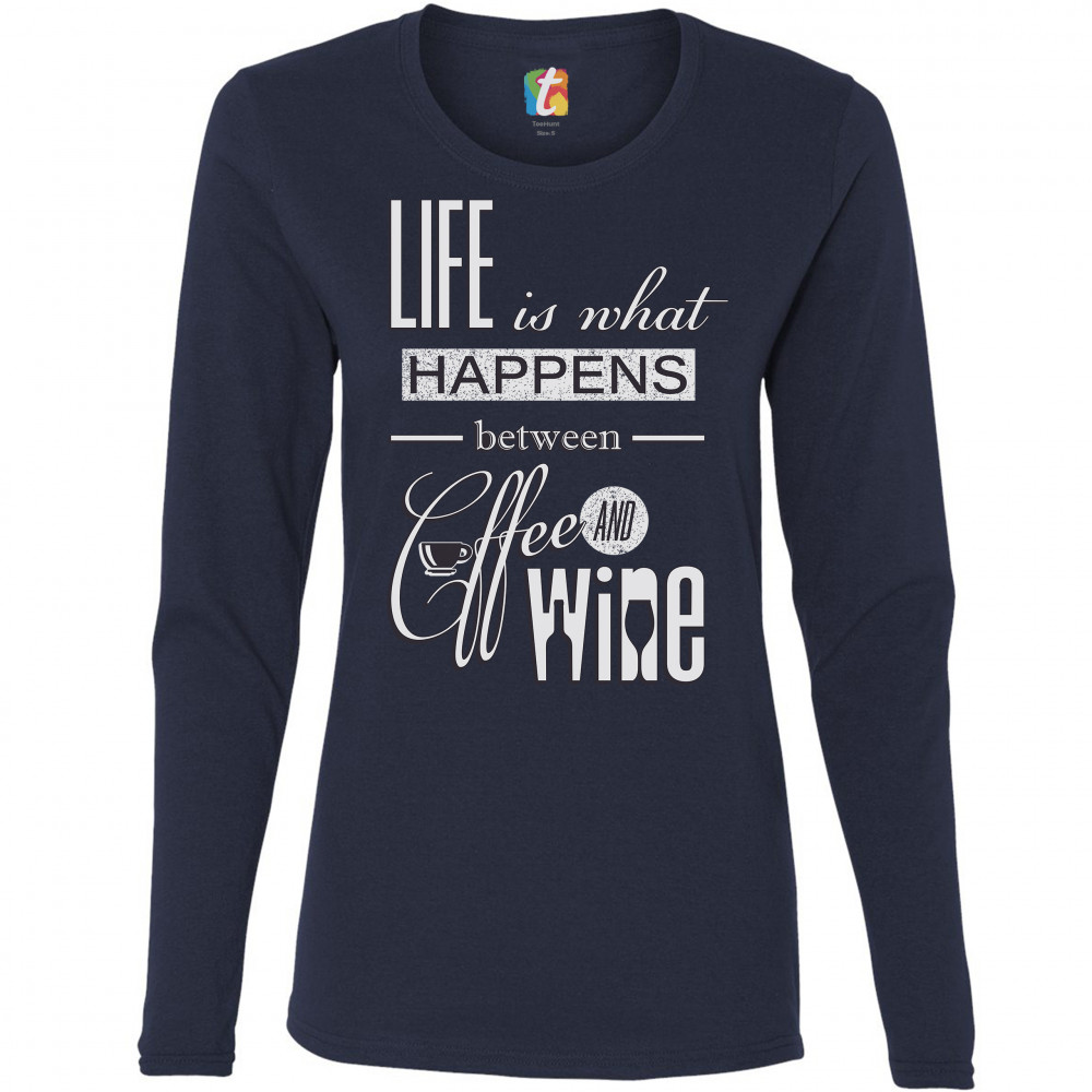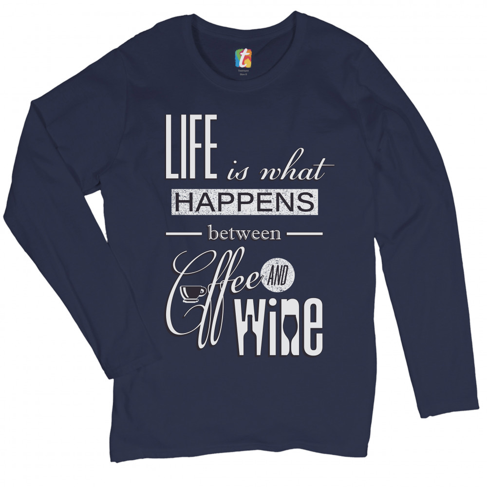 A print saying "Life is what happens between coffee and wine". Inside the letter "C" in "coffee" there is a cup and inside the word "wine" there are silhouettes of a bottle and a glass. Wear it to spread positive vibes and show your passion for the two best drinks in the universe!