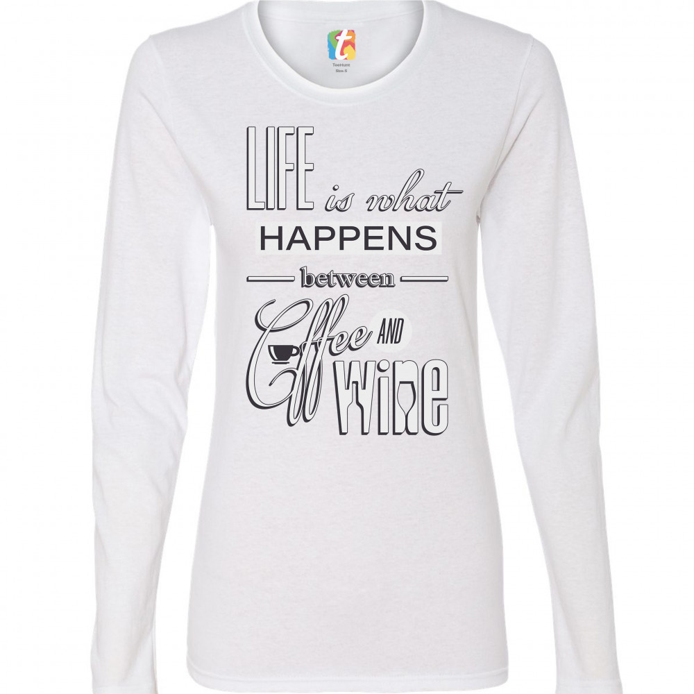 A print saying "Life is what happens between coffee and wine". Inside the letter "C" in "coffee" there is a cup and inside the word "wine" there are silhouettes of a bottle and a glass. Wear it to spread positive vibes and show your passion for the two best drinks in the universe!