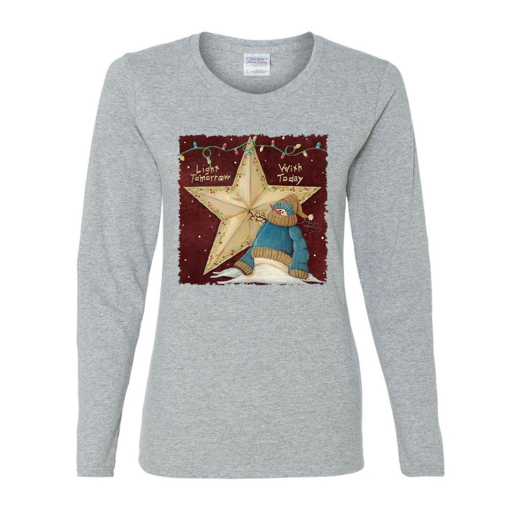 LIGHT TOMORROW WITH TODAY women's long sleeve tee cute christmas snowman holiday gray