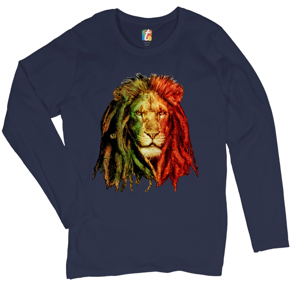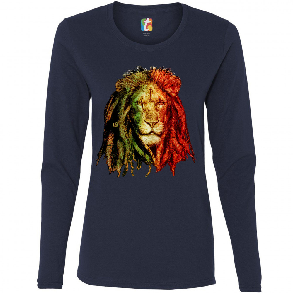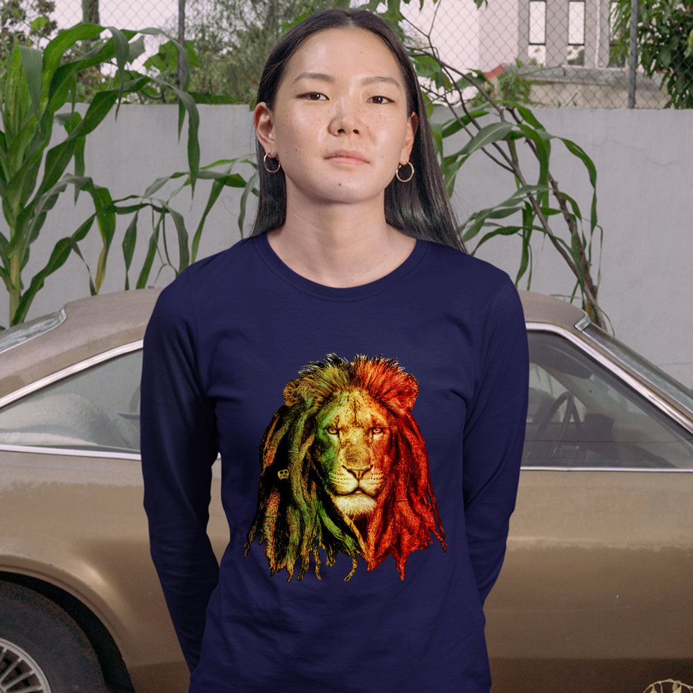 LION WITH DREADLOCKS women's long sleeve t-shirt jah jamaica marijuana 420 navy blue