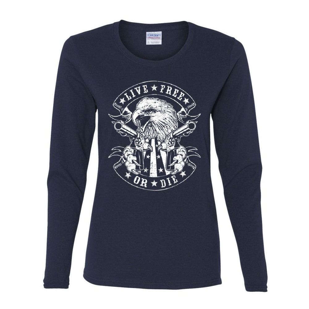 LIVE FREE OR DIE women's long sleeve tee eagle biker 2nd amendment american flag navy blue