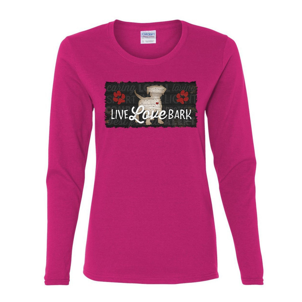 LIVE LOVE BARK women's long sleeve tee cute dog puppy doggie paw wiggle pet woof hot pink