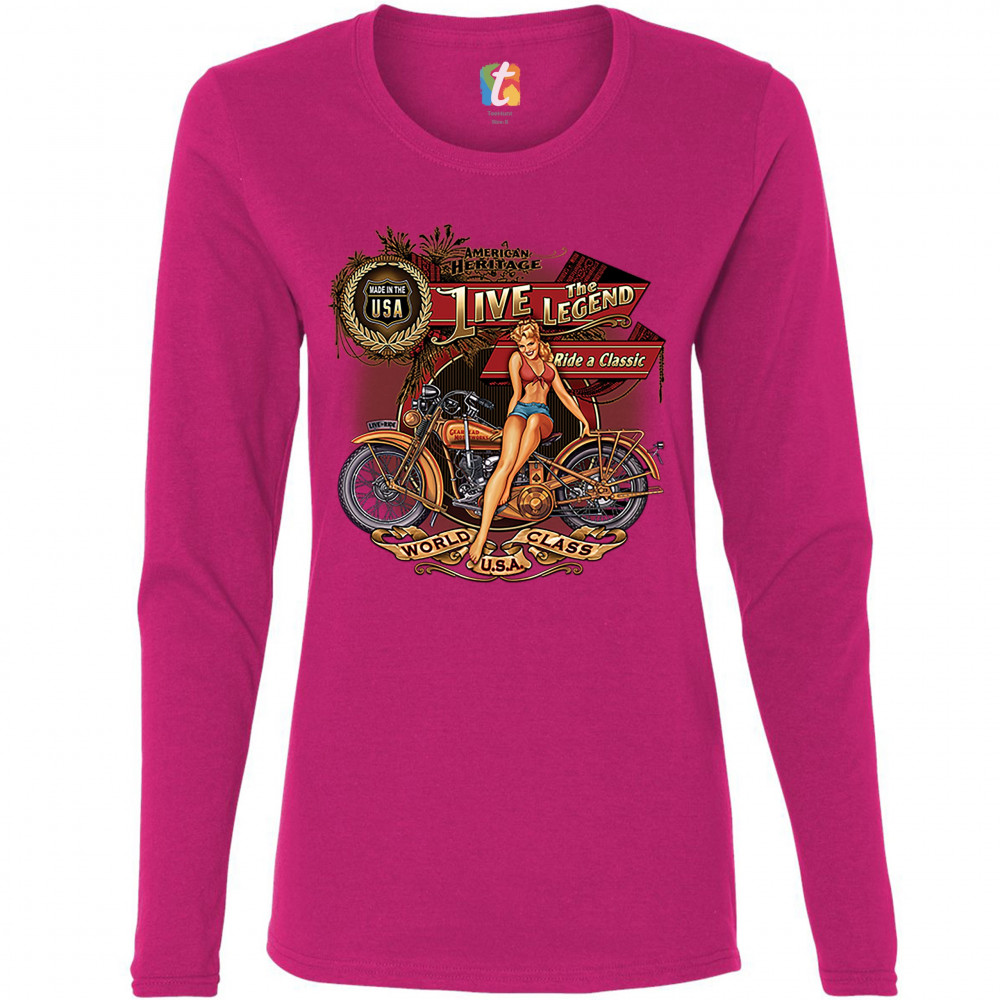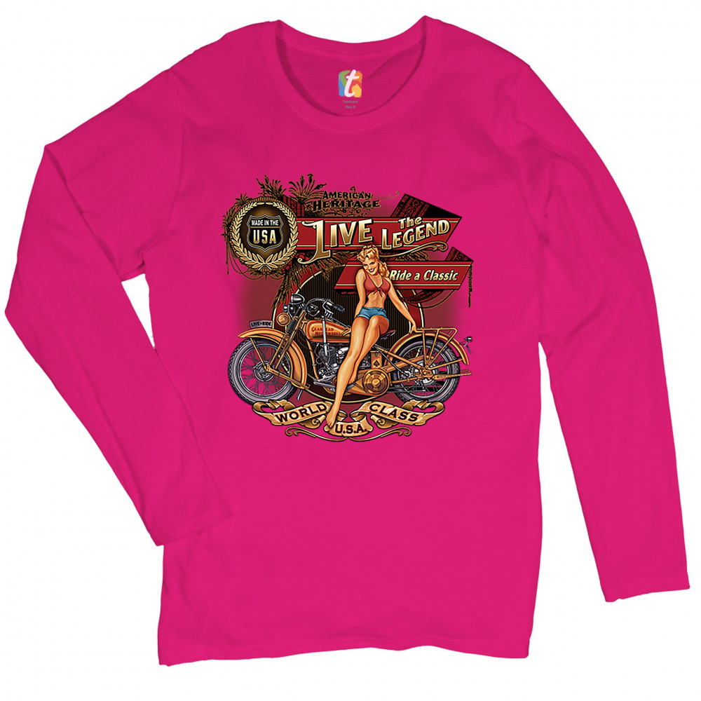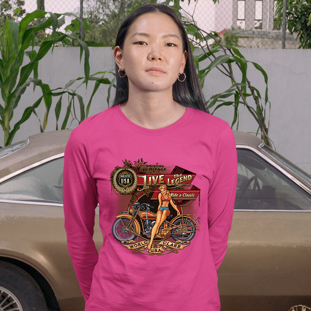 A print featuring a vintage motorcycle with a sexy girl sitting on top of it. On multiple stripes or signs the print says: "American Heritage, Made in the USA, Live the Legend, Ride a Classic, Live to Ride, World Class U.S.A." A great choice for a motorcy