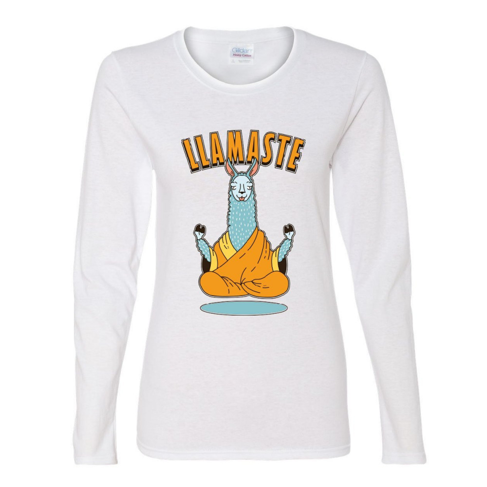 LLAMASTE women's long sleeve tee funny yoga namaste llama peace pilates lotus om white