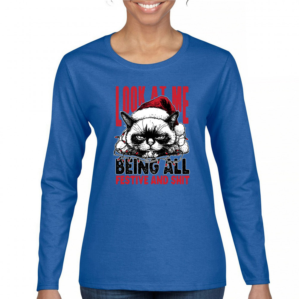 Grumpy Cat Christmas design with Santa hat, Christmas tree humor, Let It Snow vibes, Jingle Bells style, and sarcastic Merry Xmas spirit.