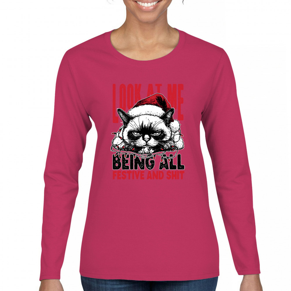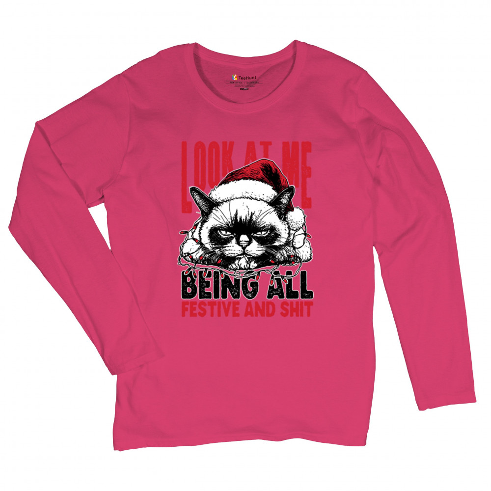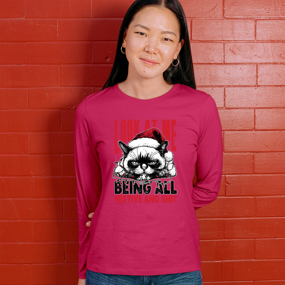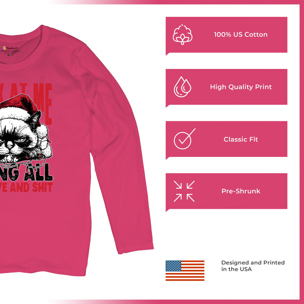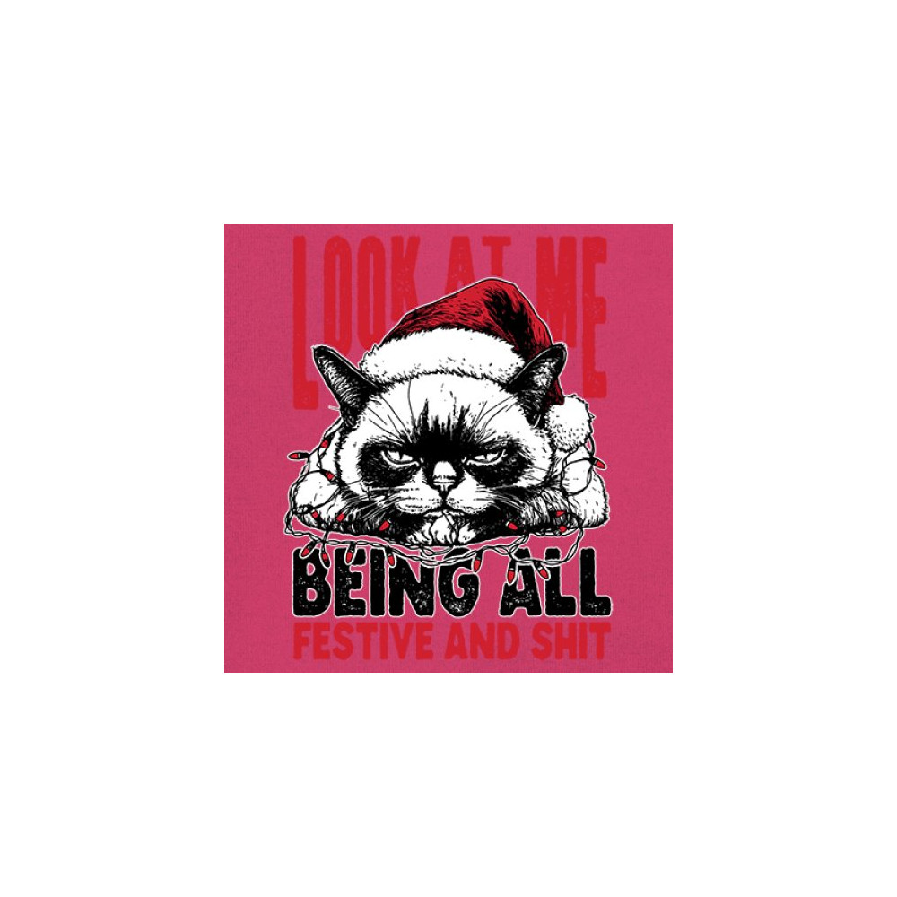 Grumpy Cat Christmas design with Santa hat, Christmas tree humor, Let It Snow vibes, Jingle Bells style, and sarcastic Merry Xmas spirit.