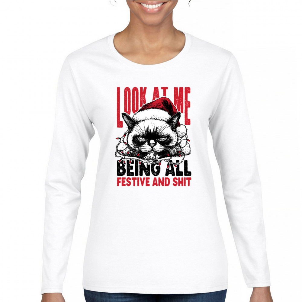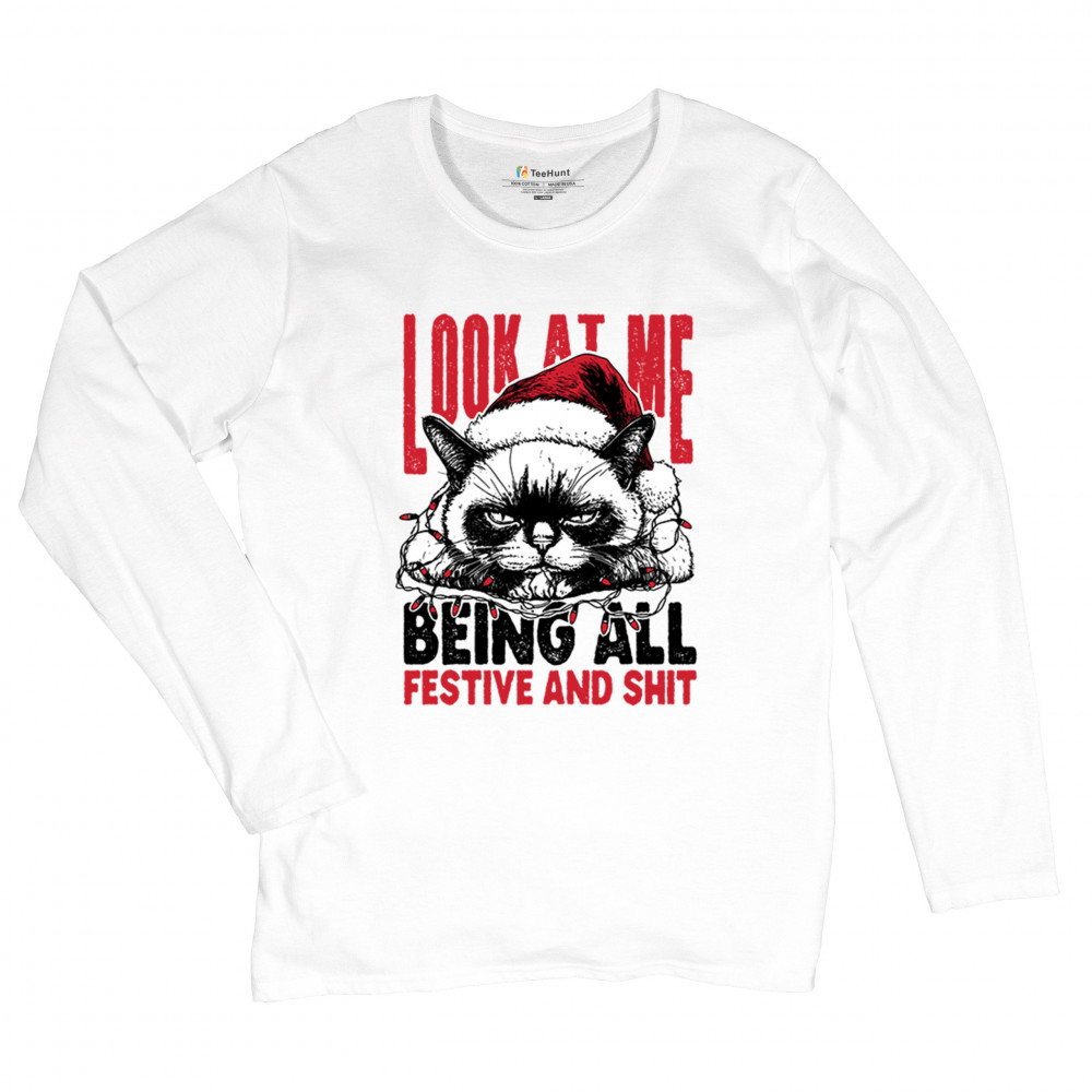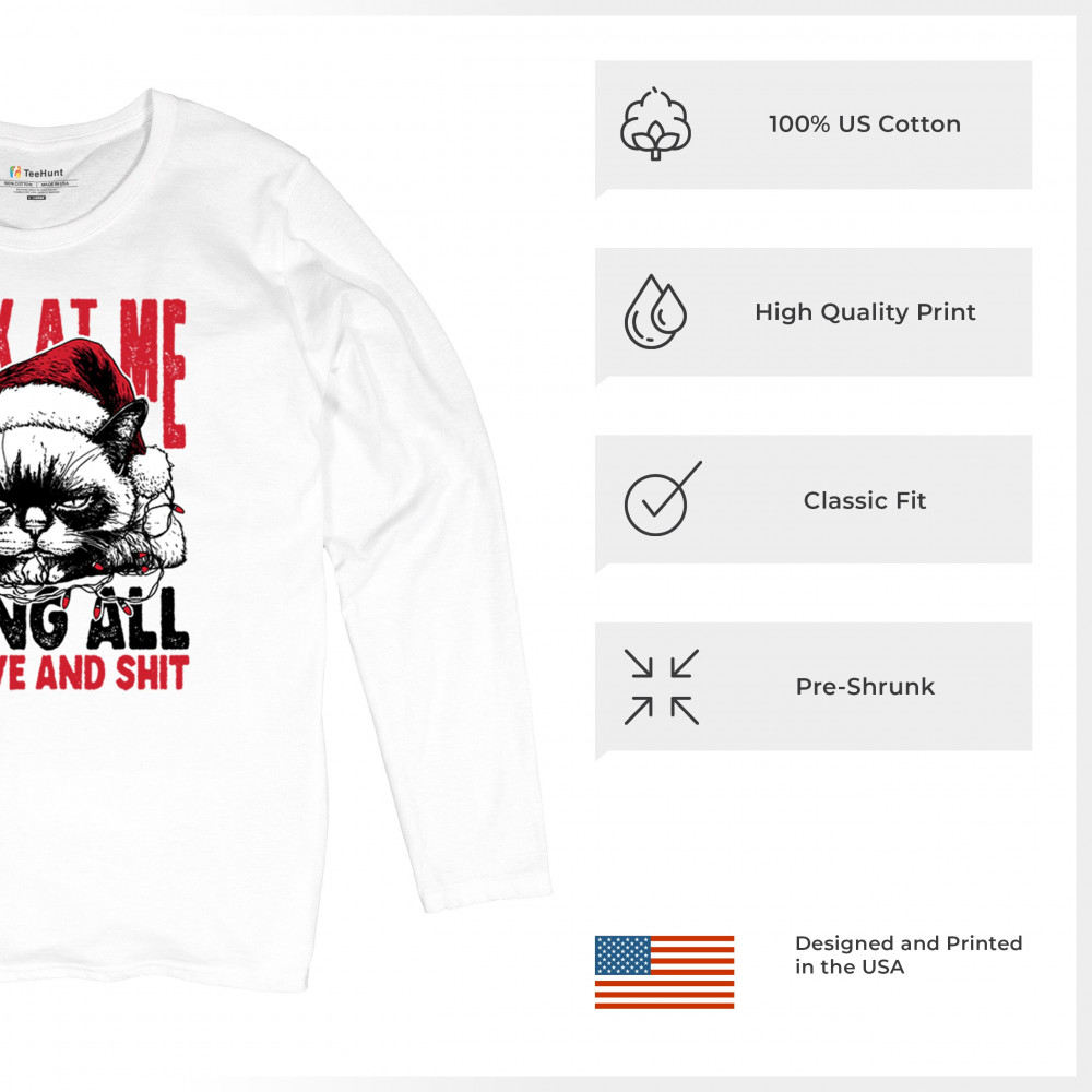 Grumpy Cat Christmas design with Santa hat, Christmas tree humor, Let It Snow vibes, Jingle Bells style, and sarcastic Merry Xmas spirit.