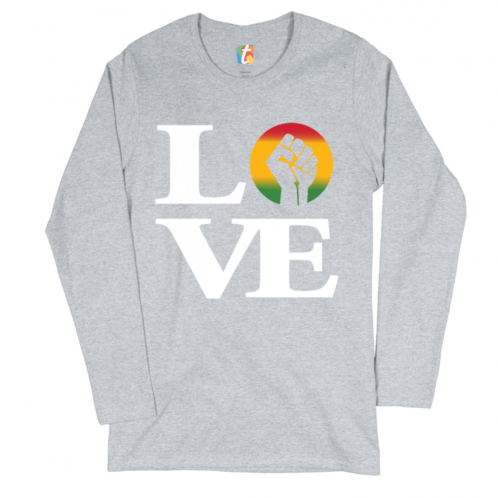 A political print depicting the word "Love" with a circle, painted in the Pan-African colors with a power fist inside of it, instead of the letter "o". Great choice to wear to spread an important message.