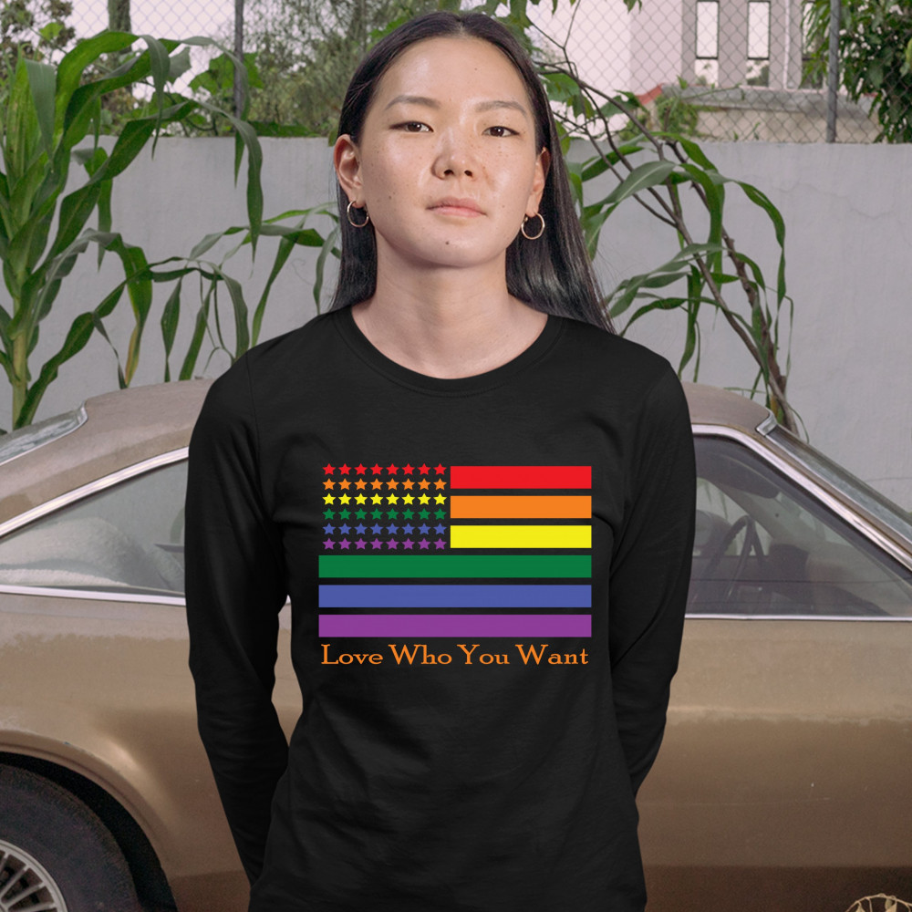 LOVE WHO YOU WANT women's long sleeve t-shirt american gay pride rainbow flag black