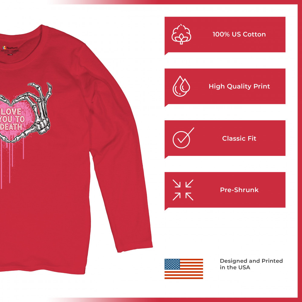Show your spooky side with this skeleton hands heart design featuring a pink background and the phrase "Love You to Death." A perfect piece for alternative couples, Halloween lovers, and romantic rebels who embrace both affection and dark humor. Great for spooky season, date nights, and alt fashion outfits.