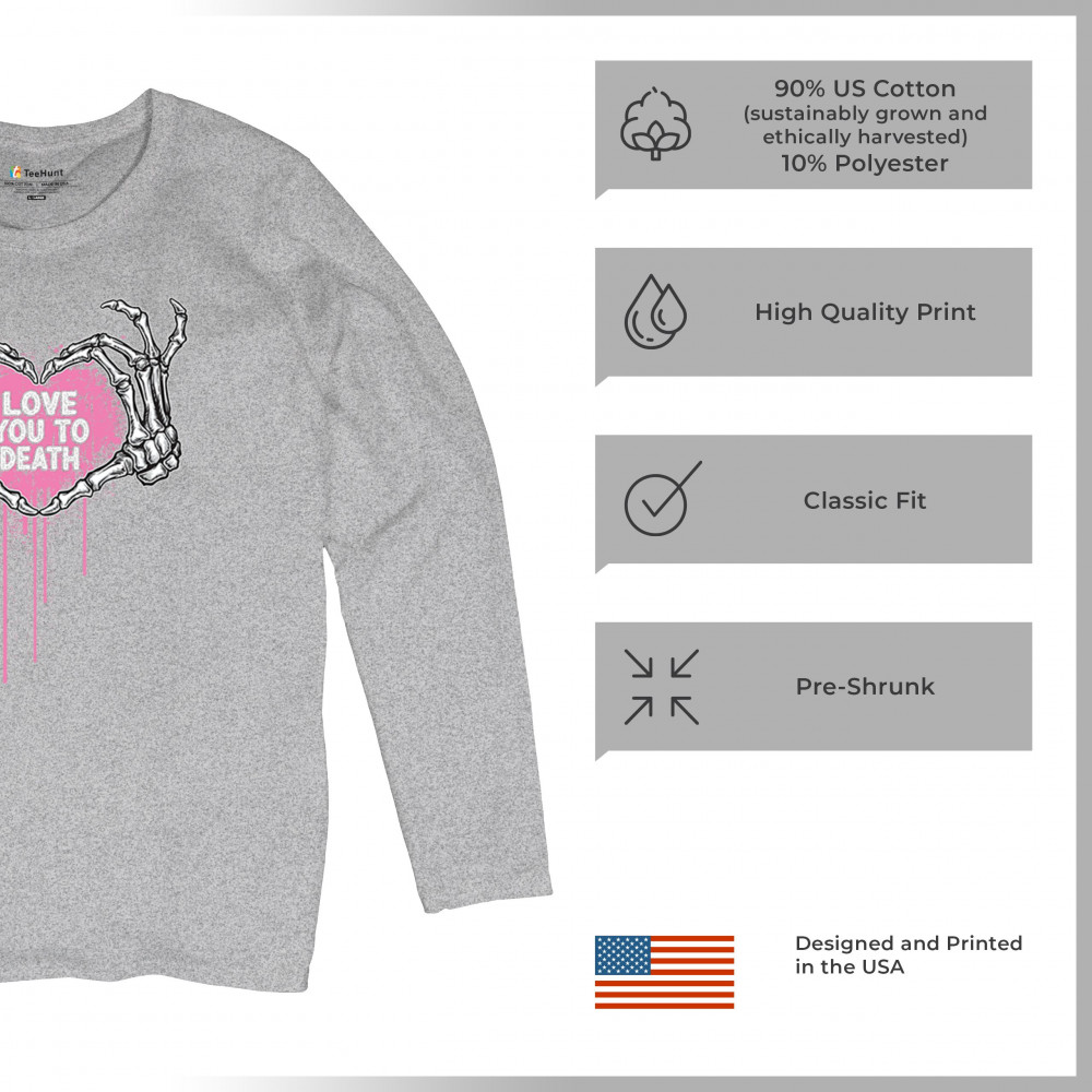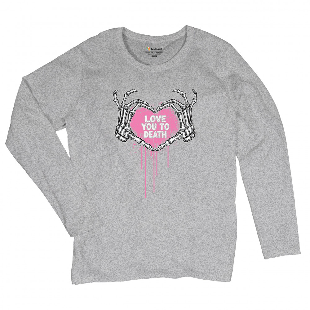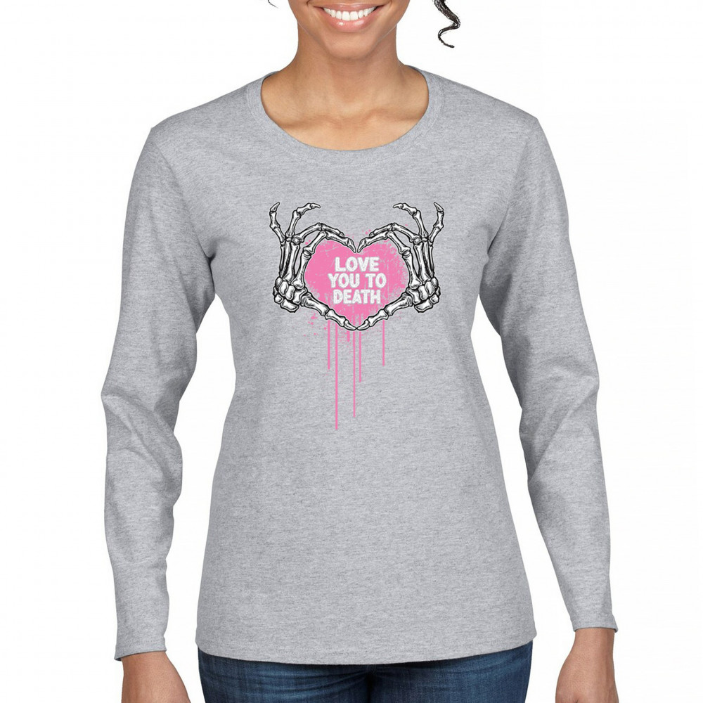 Show your spooky side with this skeleton hands heart design featuring a pink background and the phrase "Love You to Death." A perfect piece for alternative couples, Halloween lovers, and romantic rebels who embrace both affection and dark humor. Great for spooky season, date nights, and alt fashion outfits.