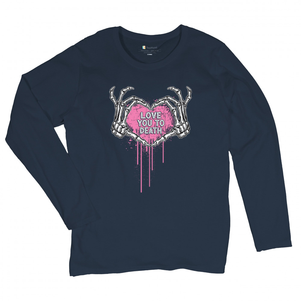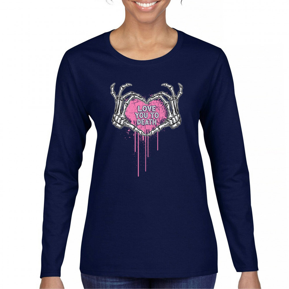Show your spooky side with this skeleton hands heart design featuring a pink background and the phrase "Love You to Death." A perfect piece for alternative couples, Halloween lovers, and romantic rebels who embrace both affection and dark humor. Great for spooky season, date nights, and alt fashion outfits.