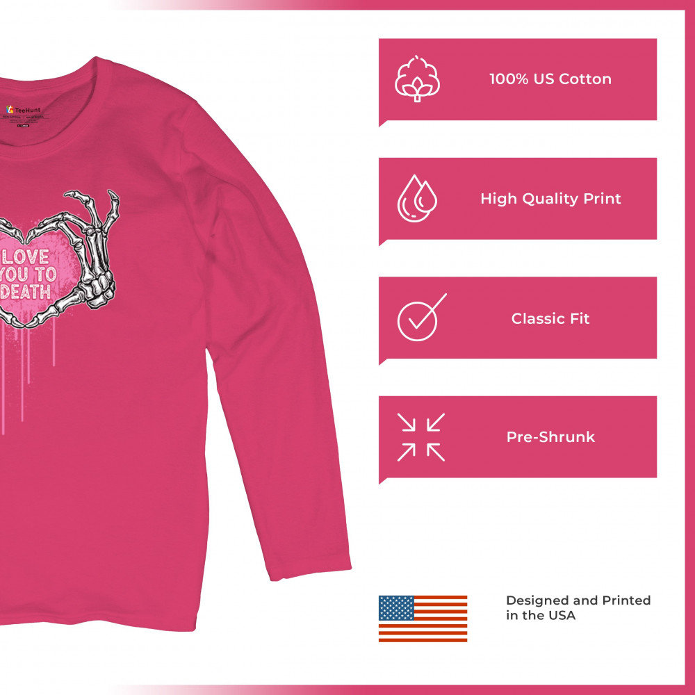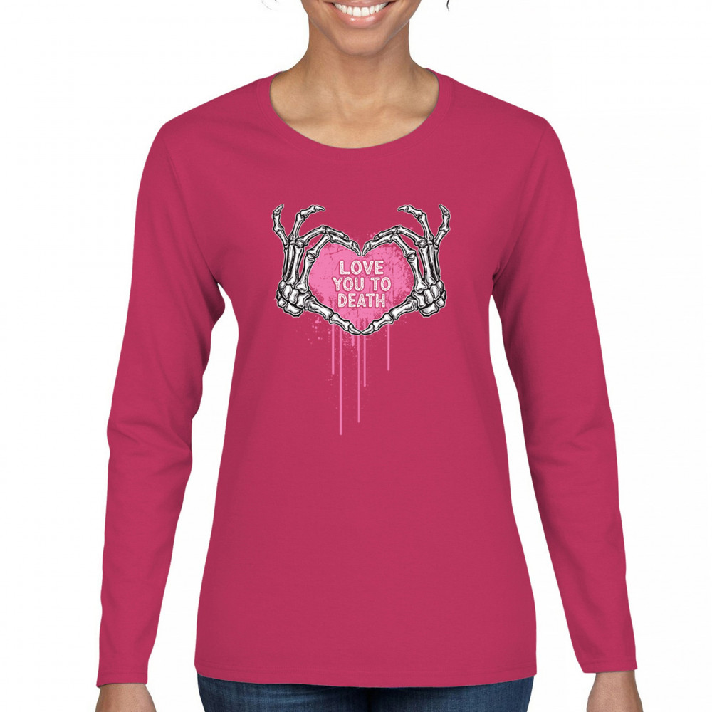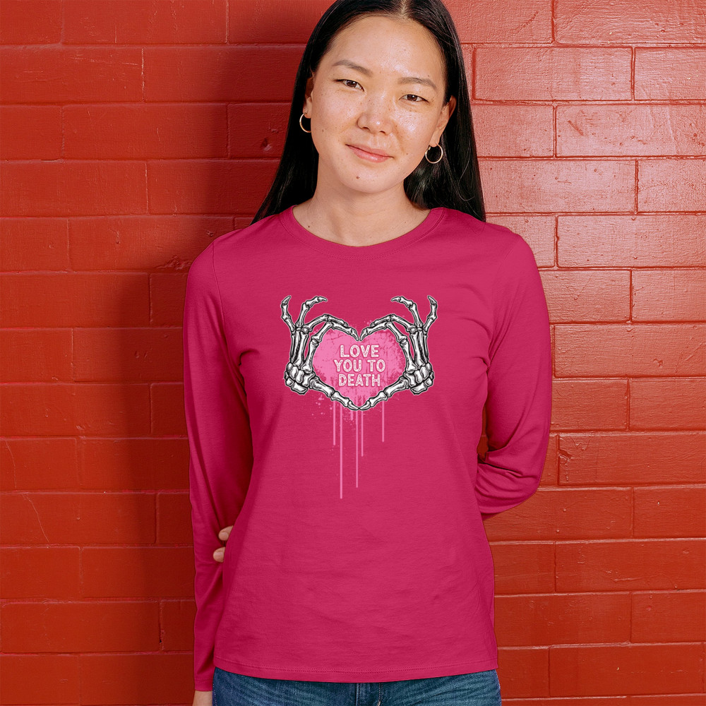 Show your spooky side with this skeleton hands heart design featuring a pink background and the phrase "Love You to Death." A perfect piece for alternative couples, Halloween lovers, and romantic rebels who embrace both affection and dark humor. Great for spooky season, date nights, and alt fashion outfits.