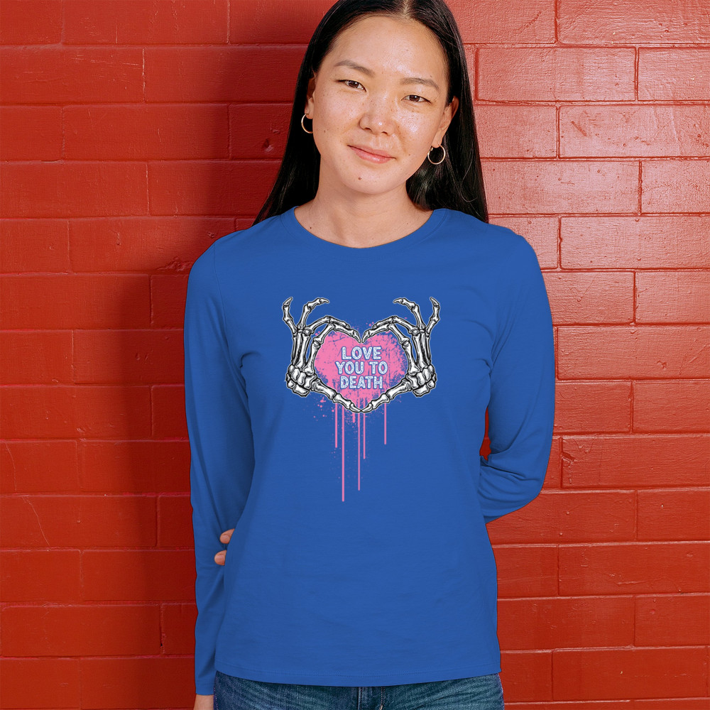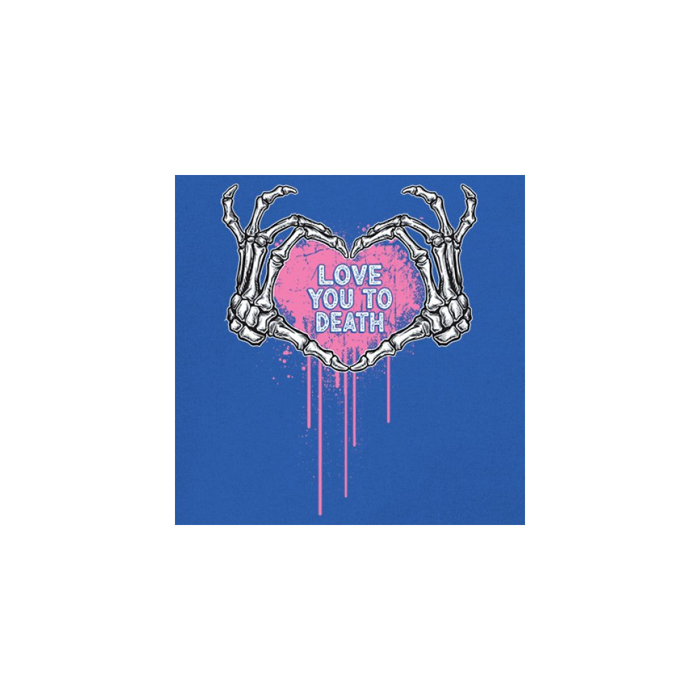 Show your spooky side with this skeleton hands heart design featuring a pink background and the phrase "Love You to Death." A perfect piece for alternative couples, Halloween lovers, and romantic rebels who embrace both affection and dark humor. Great for spooky season, date nights, and alt fashion outfits.