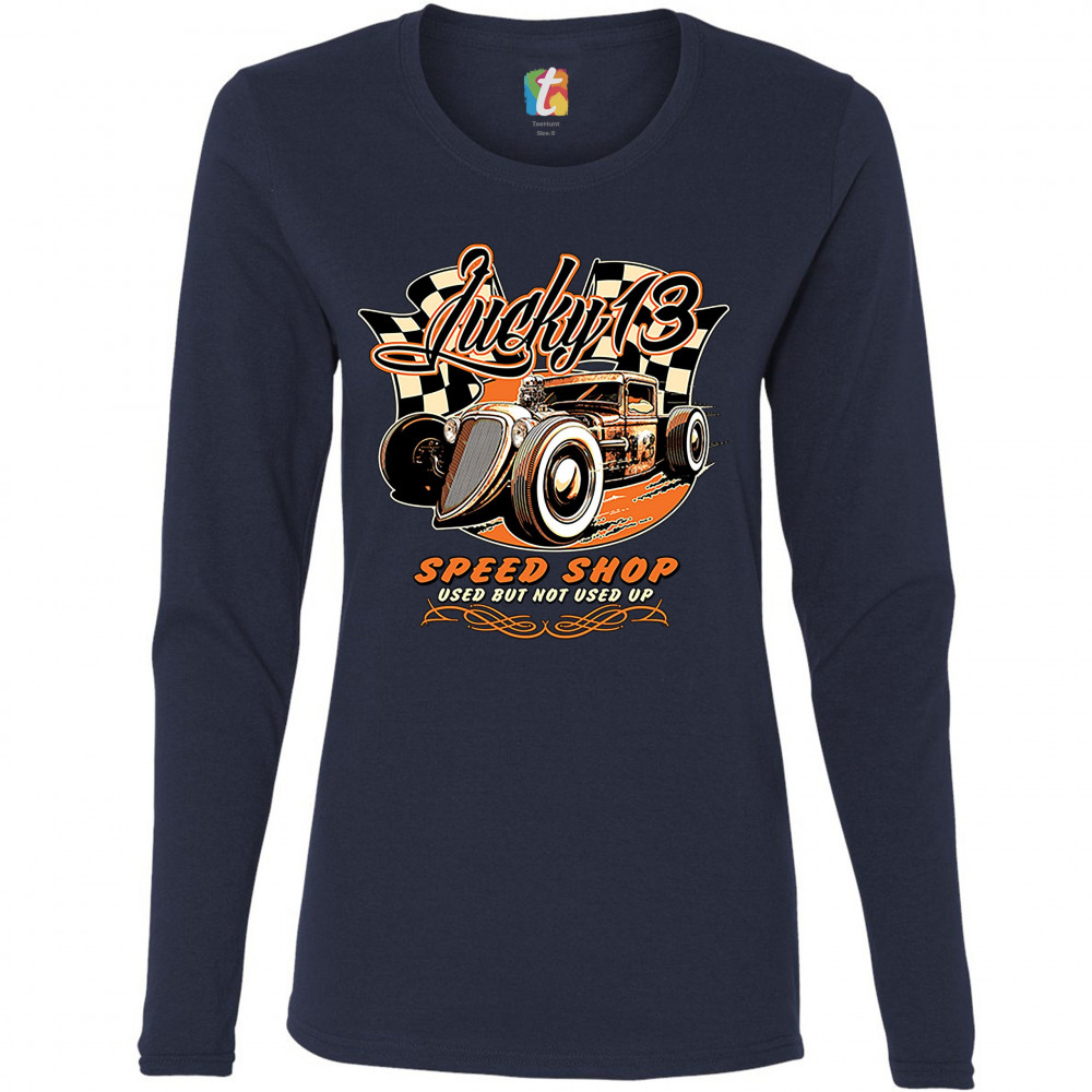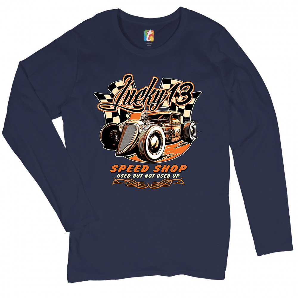 LUCKY 13 SPEED SHOP women's long sleeve t-shirt rat rod route 66 racing car navy blue