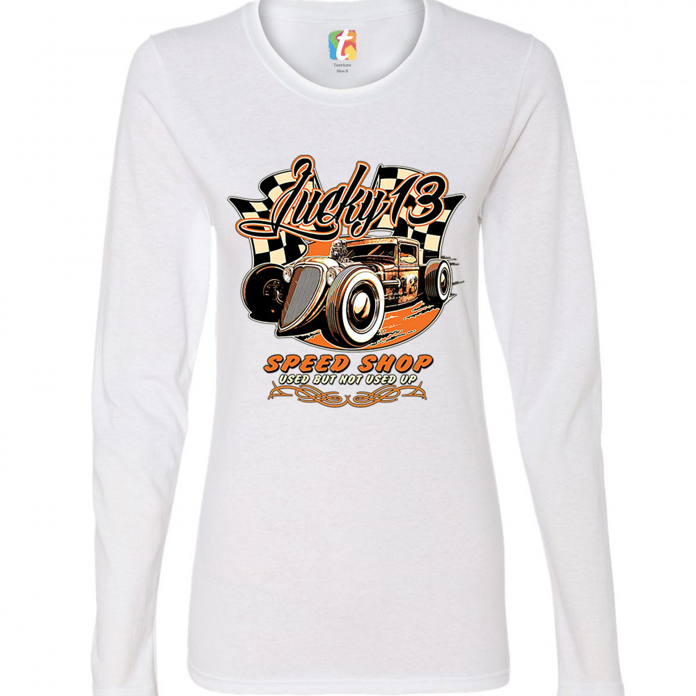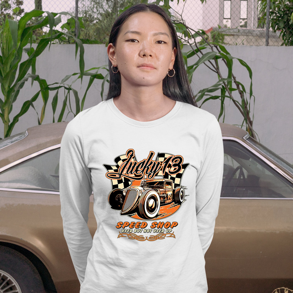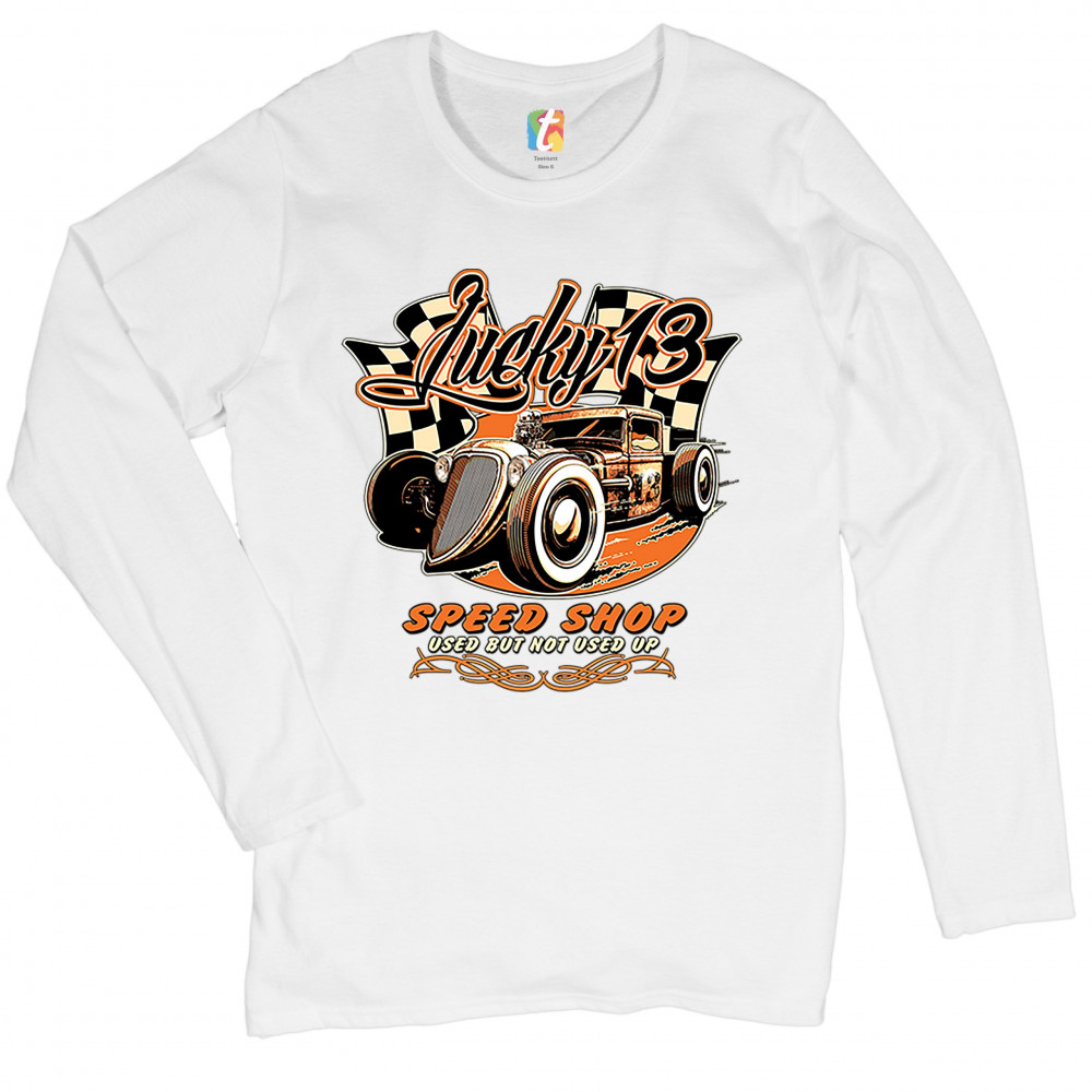 LUCKY 13 SPEED SHOP women's long sleeve t-shirt rat rod route 66 racing car white