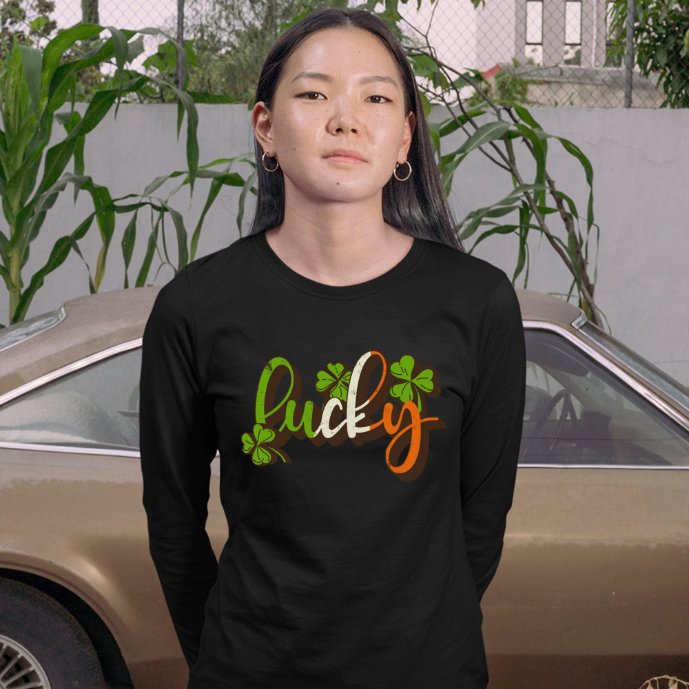 A print featuring the word "Lucky" with several shamrocks around it. A great choice to wear on March 17 to celebrate the St. Patrick's Day and showcase your Irish personlaity!