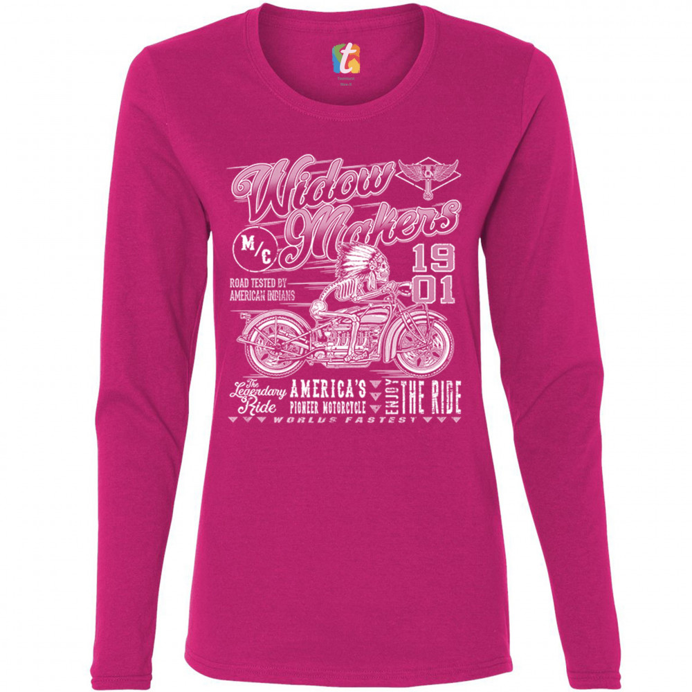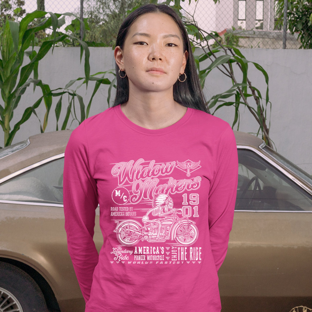 A print featuring a skeleton wearing a native American warbonnet and riding a bobber motorcycle. There is also a logo with a winged piston in the top right corner. The print says: "M/C Widowmakers 1901, road tested by American Indians, the legendary ride,