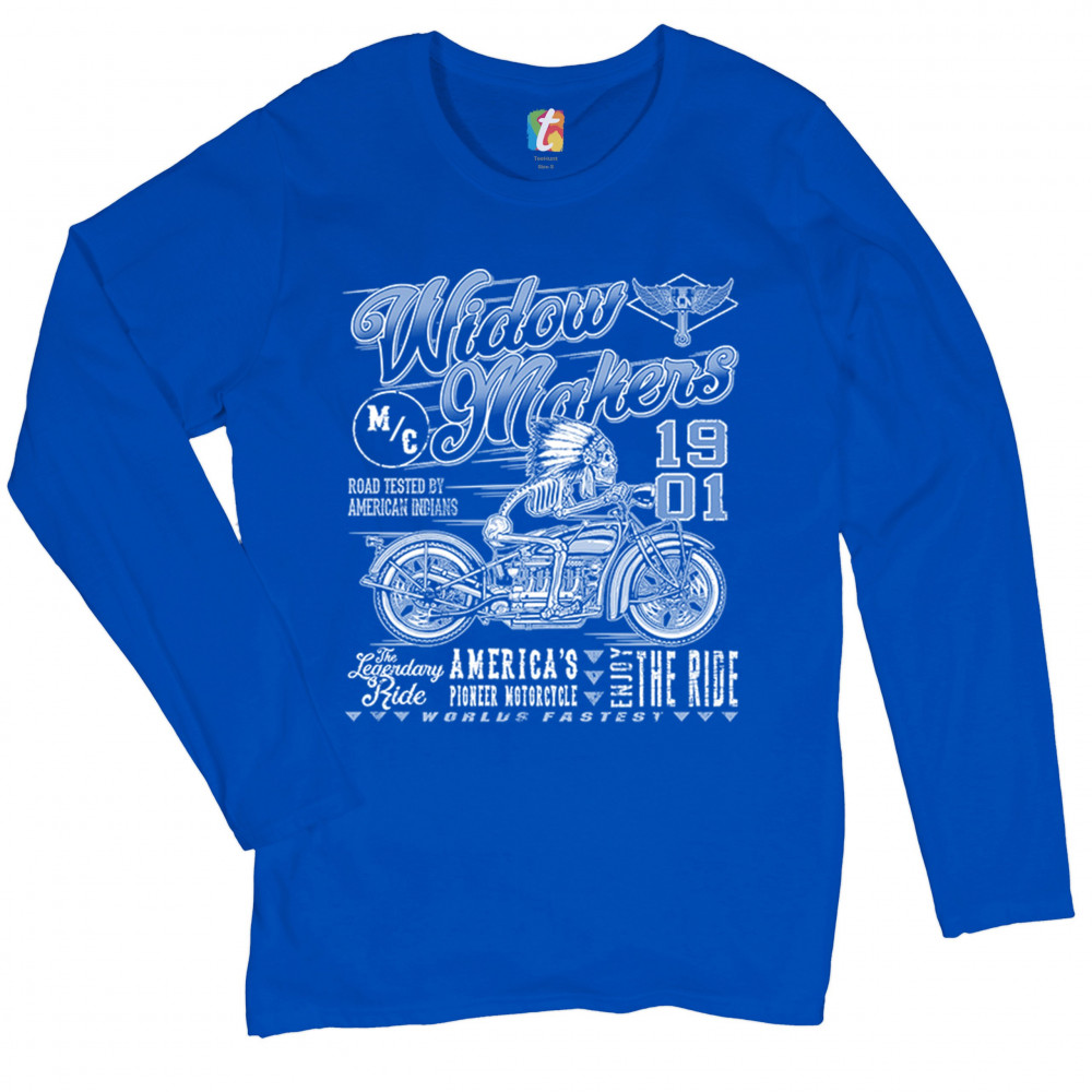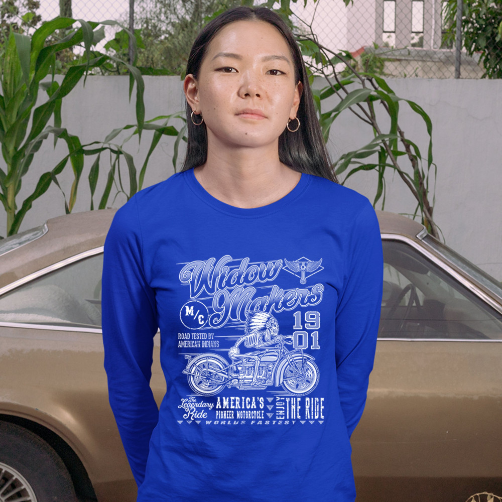 M/C WIDOWMAKERS 1901 women's long sleeve t-shirt native american bikers bobber royal blue