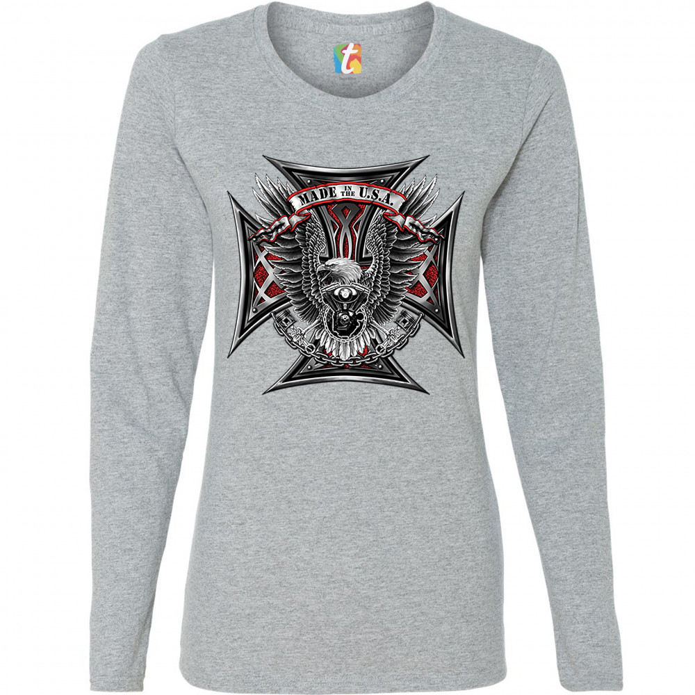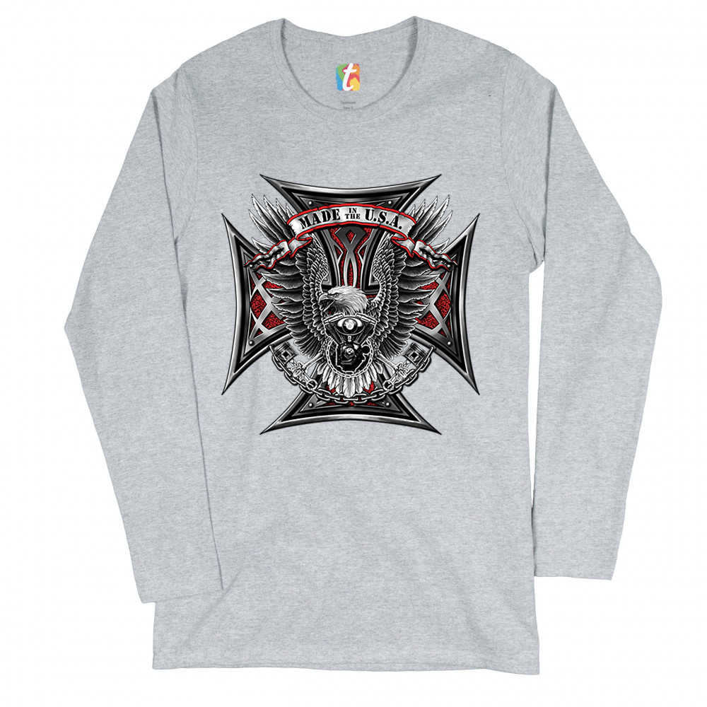 A print featuring a huge cross. In the front there is a bald eagle spreading it's wings and holding pistons in it's talons. In front of it's chest there is a V engine. At the top there is a stripe with "Made in the USA" written on it. A great choice for a