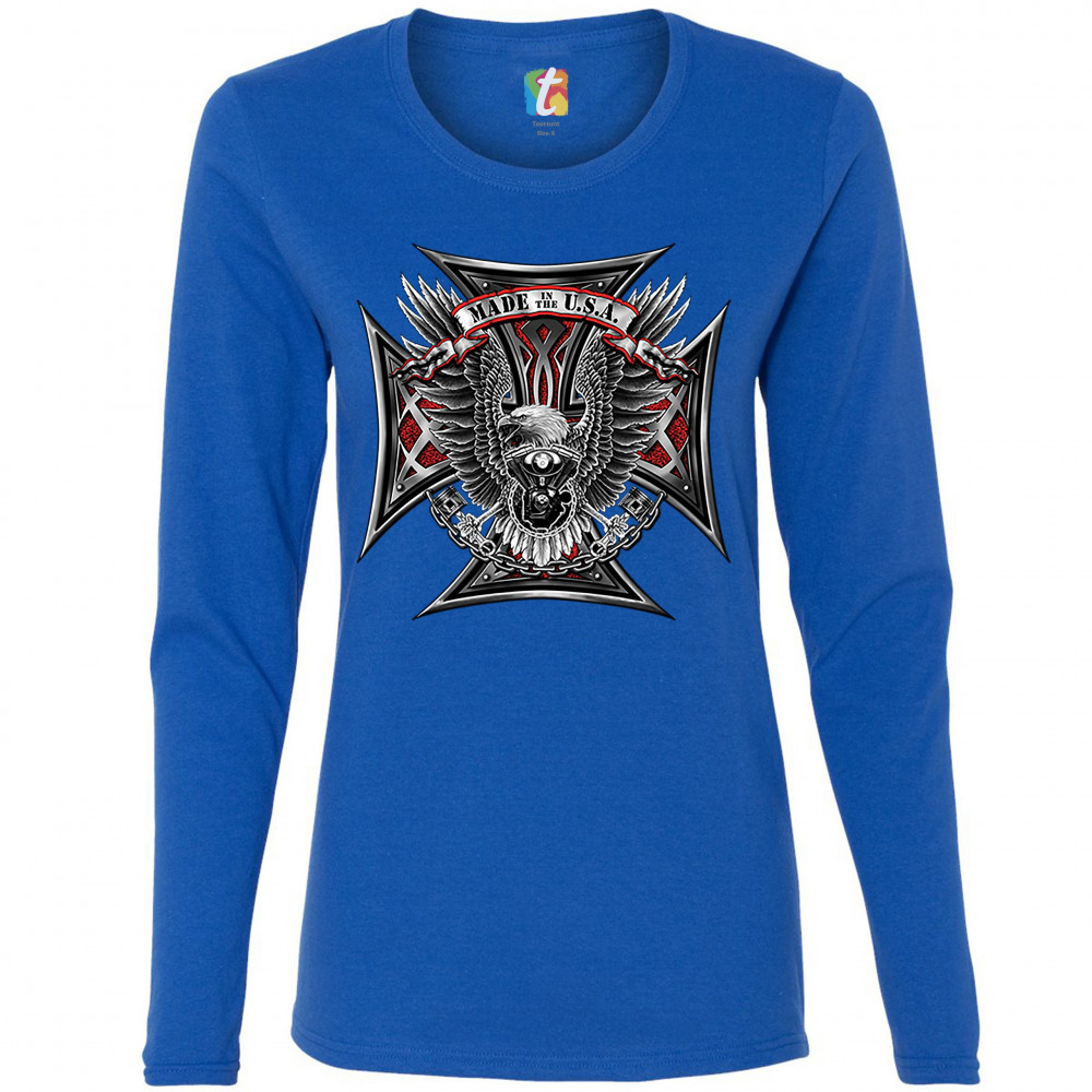 MADE IN THE USA BIKER CROSS women's long sleeve t-shirt bald eagle motorcycle royal blue