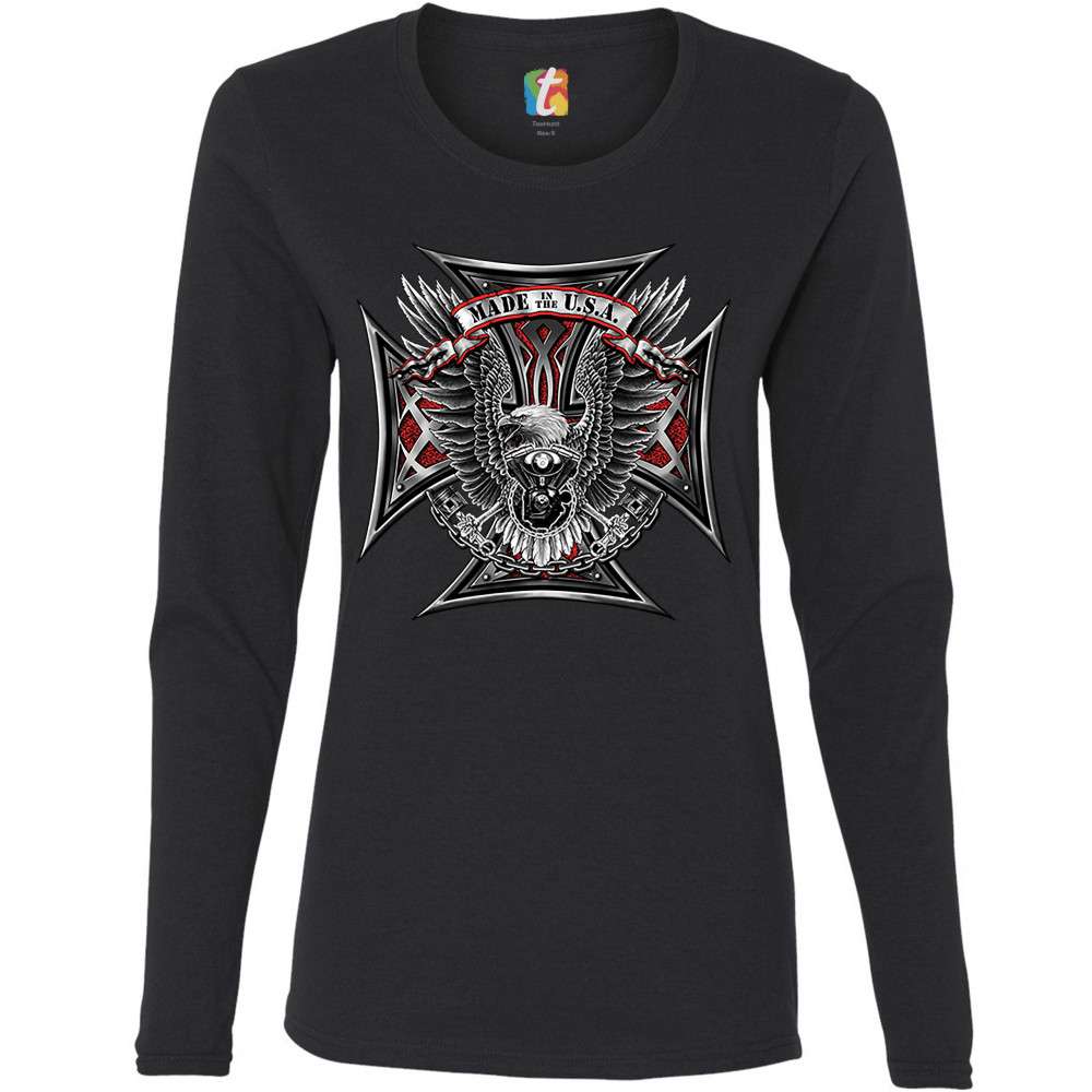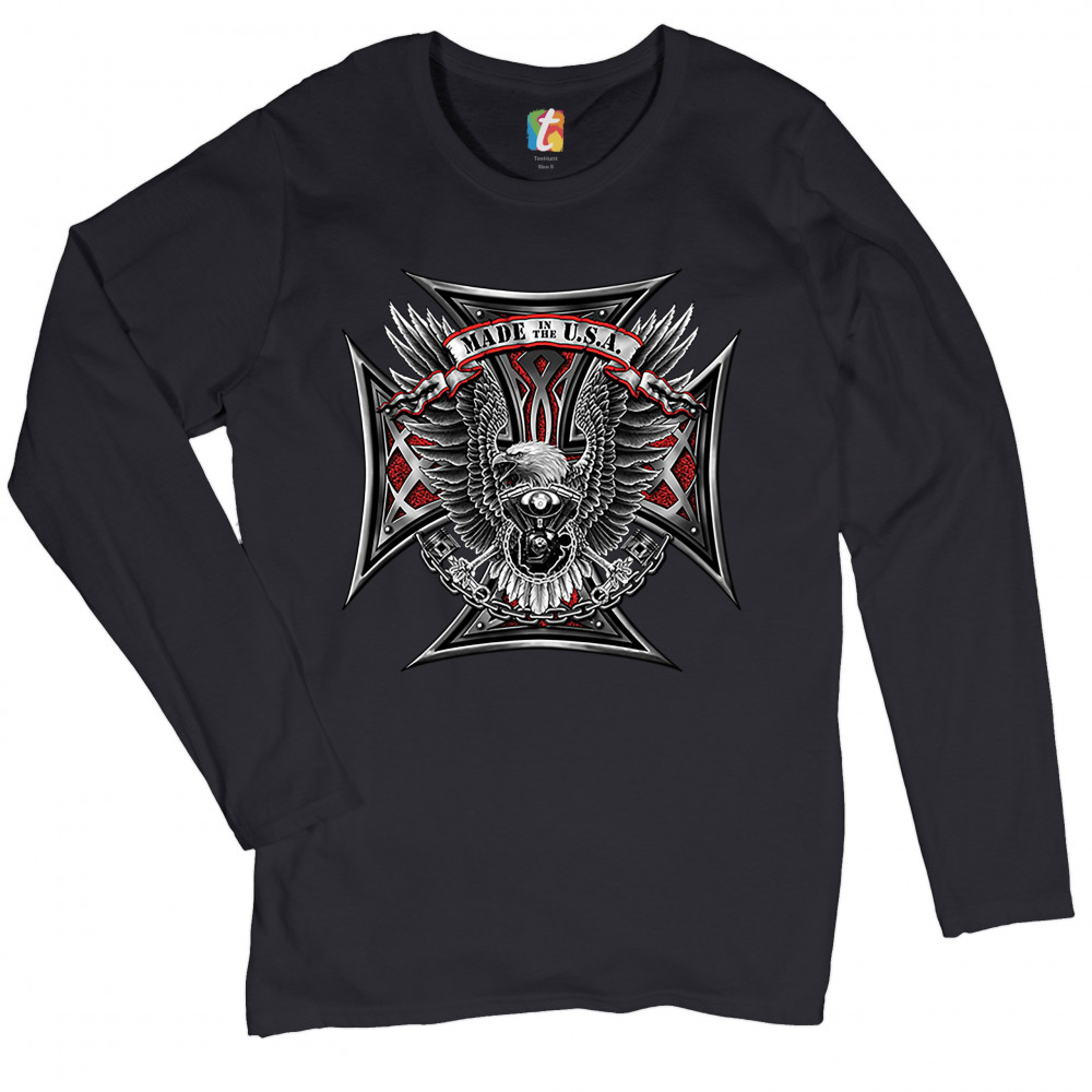 A print featuring a huge cross. In the front there is a bald eagle spreading it's wings and holding pistons in it's talons. In front of it's chest there is a V engine. At the top there is a stripe with "Made in the USA" written on it. A great choice for a