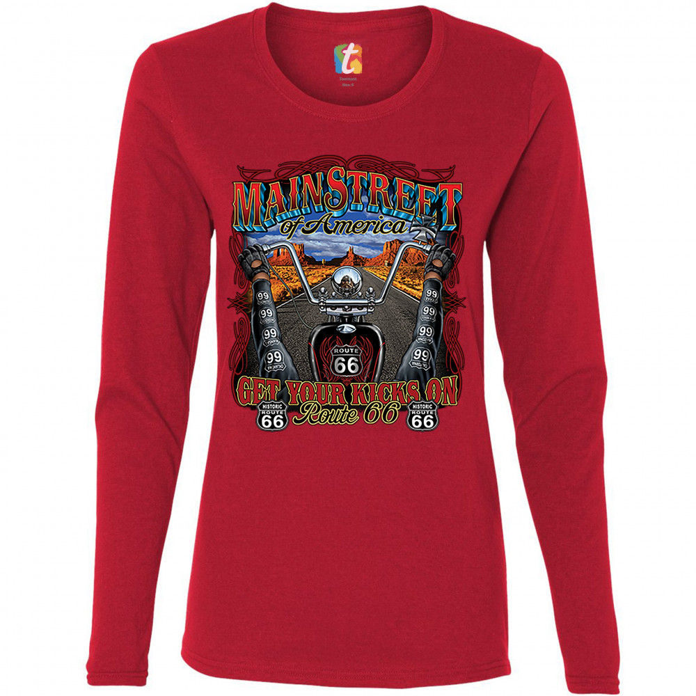 A print featuring a POV of a biker riding a chopper on a Route 66. There are are numerous "Route 66" and "Historic Route 66" signs all over the print and the print says: "Main street of America" and "Gwt your kicks on Route 66". A great choice for a motor