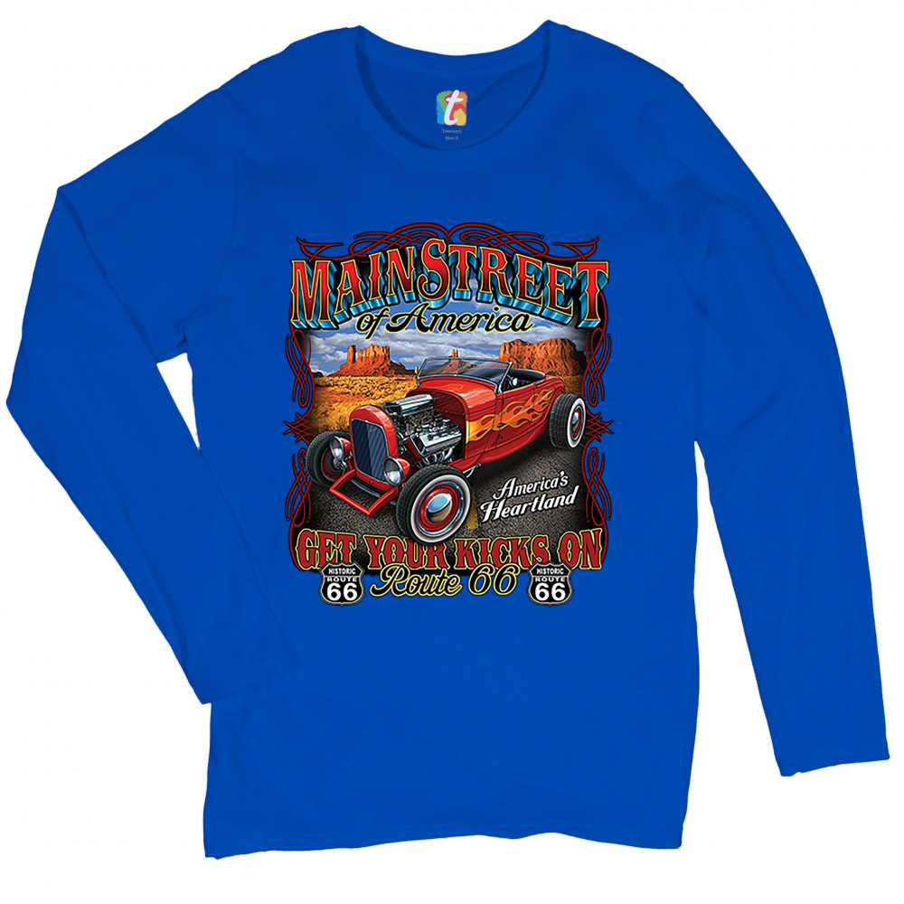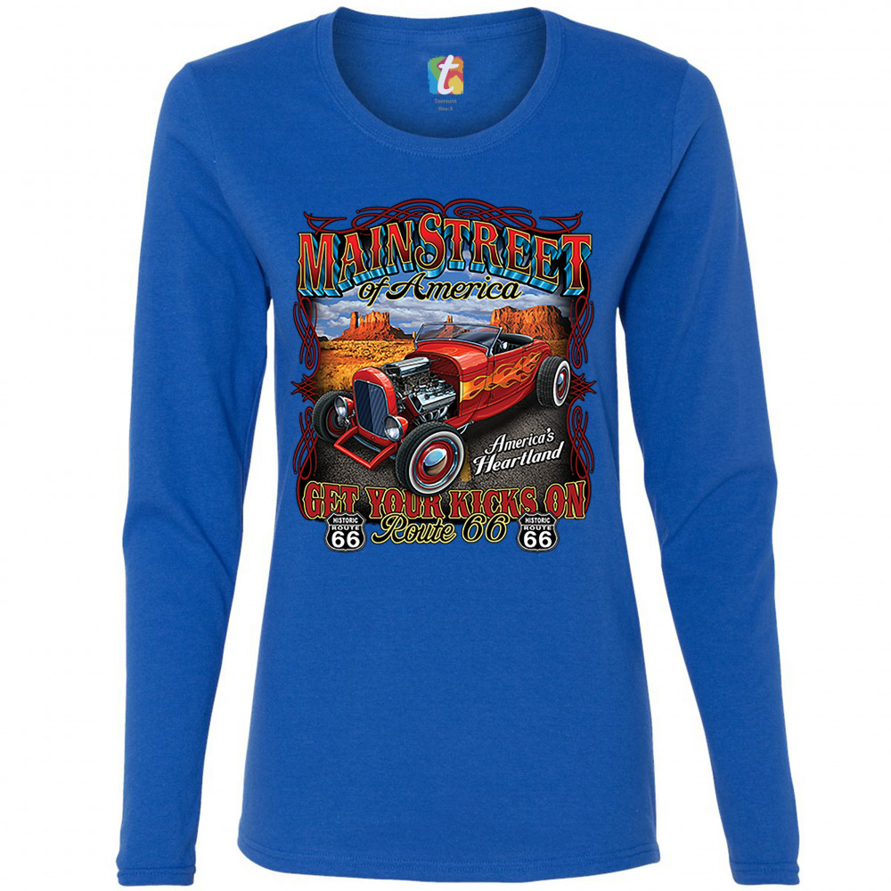 MAIN STREET OF AMERICA women's long sleeve t-shirt route 66 vintage hot rod royal blue