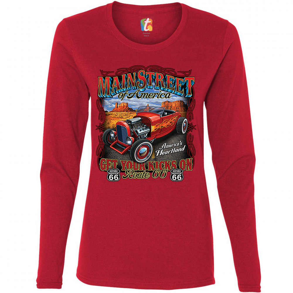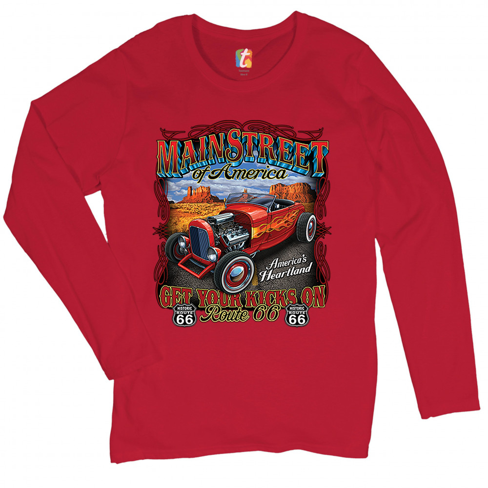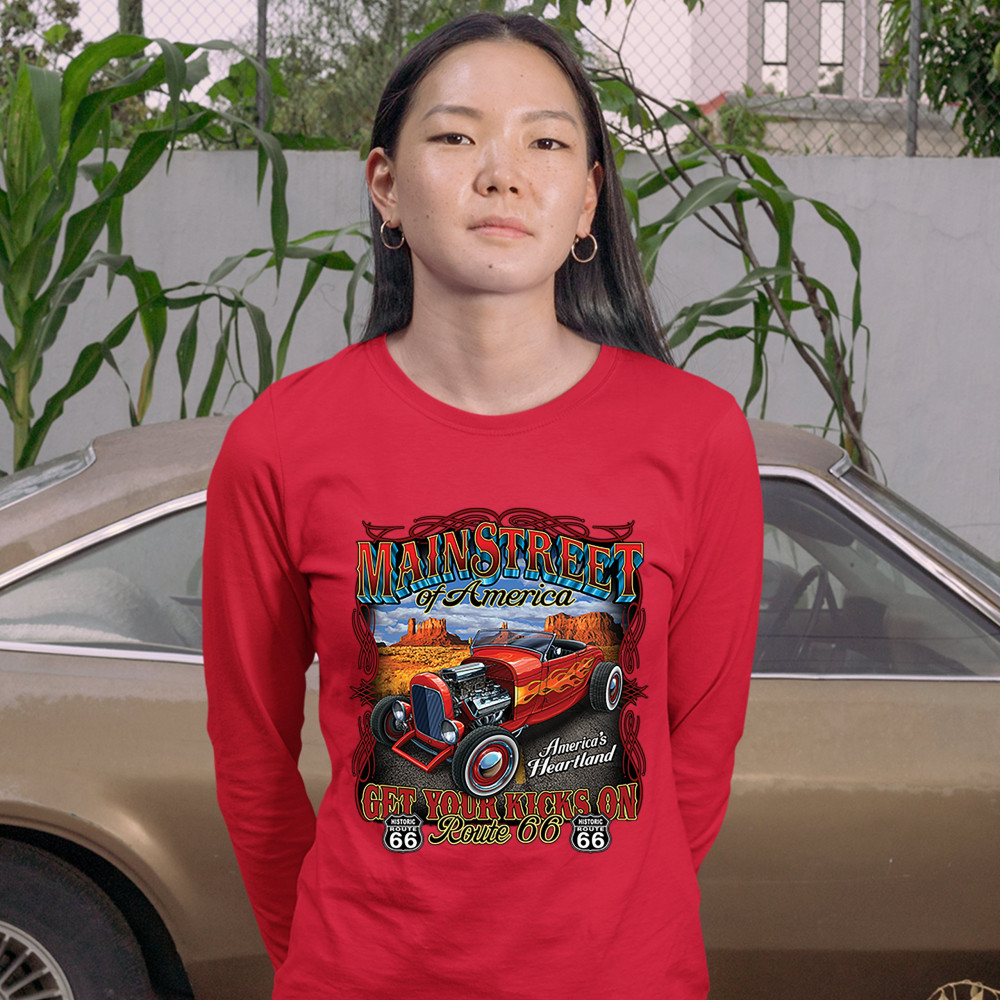A print featuring a vintage hot rod with an exposed engine and flame paint job parked on a highway. The print says: "Main Street of America", "America's Heartland" and "Get Your Kicks on Route 66". The print also features two Route 66 signs. A great choic