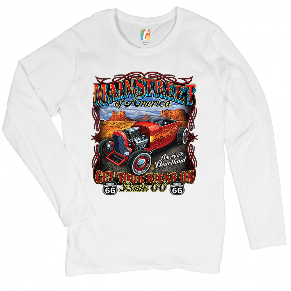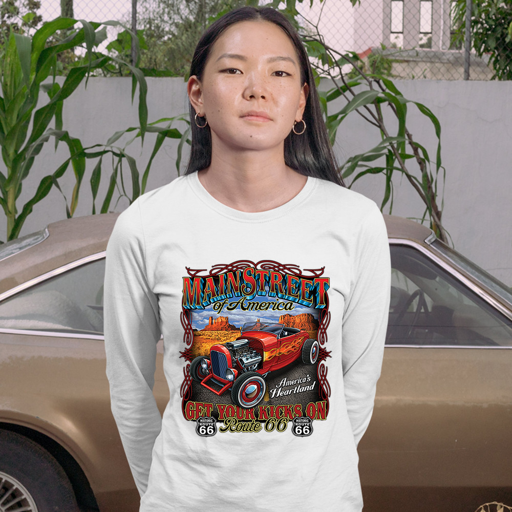 A print featuring a vintage hot rod with an exposed engine and flame paint job parked on a highway. The print says: "Main Street of America", "America's Heartland" and "Get Your Kicks on Route 66". The print also features two Route 66 signs. A great choic