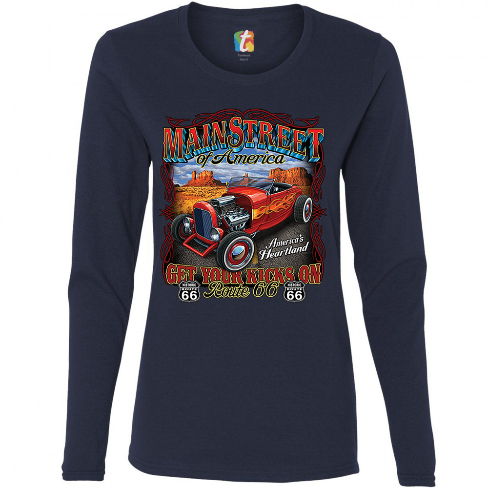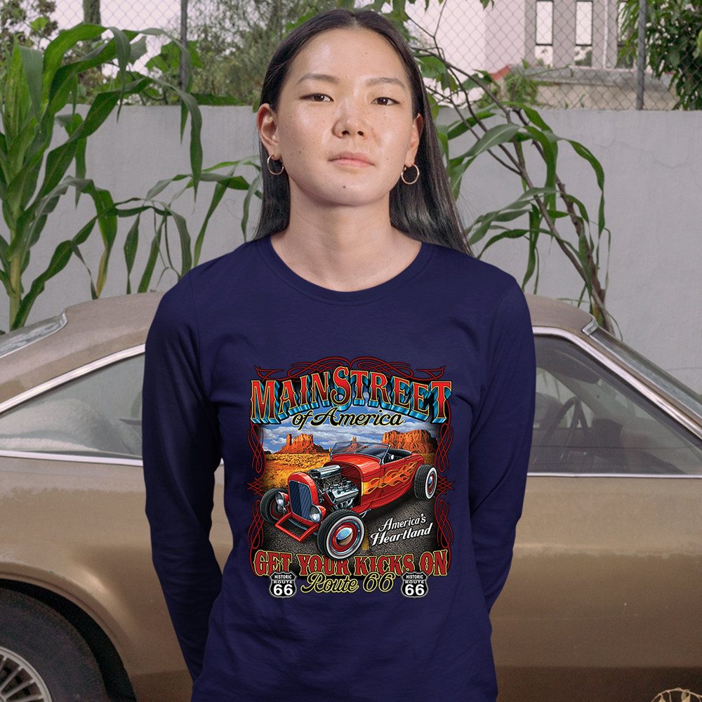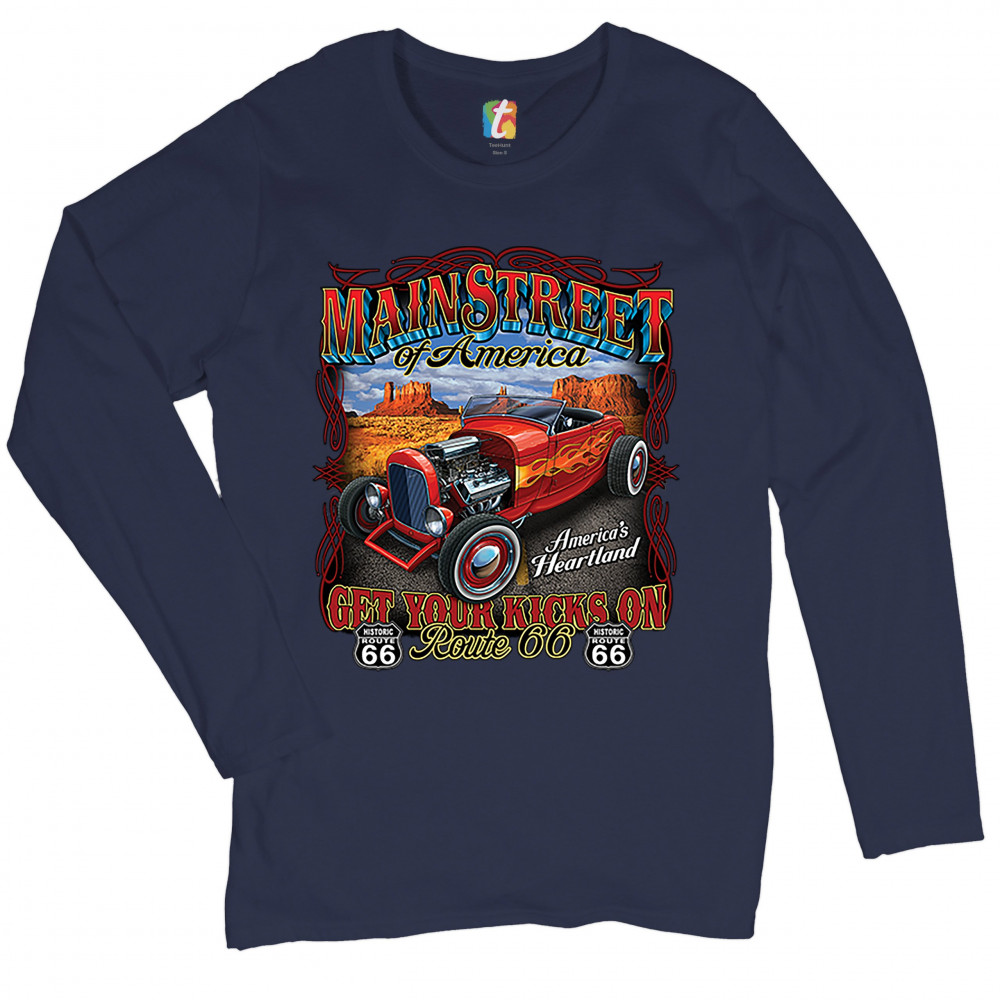 MAIN STREET OF AMERICA women's long sleeve t-shirt route 66 vintage hot rod navy blue