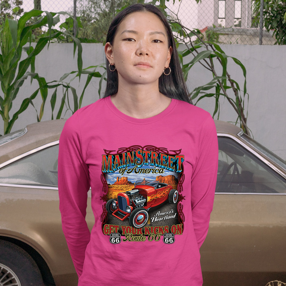 A print featuring a vintage hot rod with an exposed engine and flame paint job parked on a highway. The print says: "Main Street of America", "America's Heartland" and "Get Your Kicks on Route 66". The print also features two Route 66 signs. A great choic