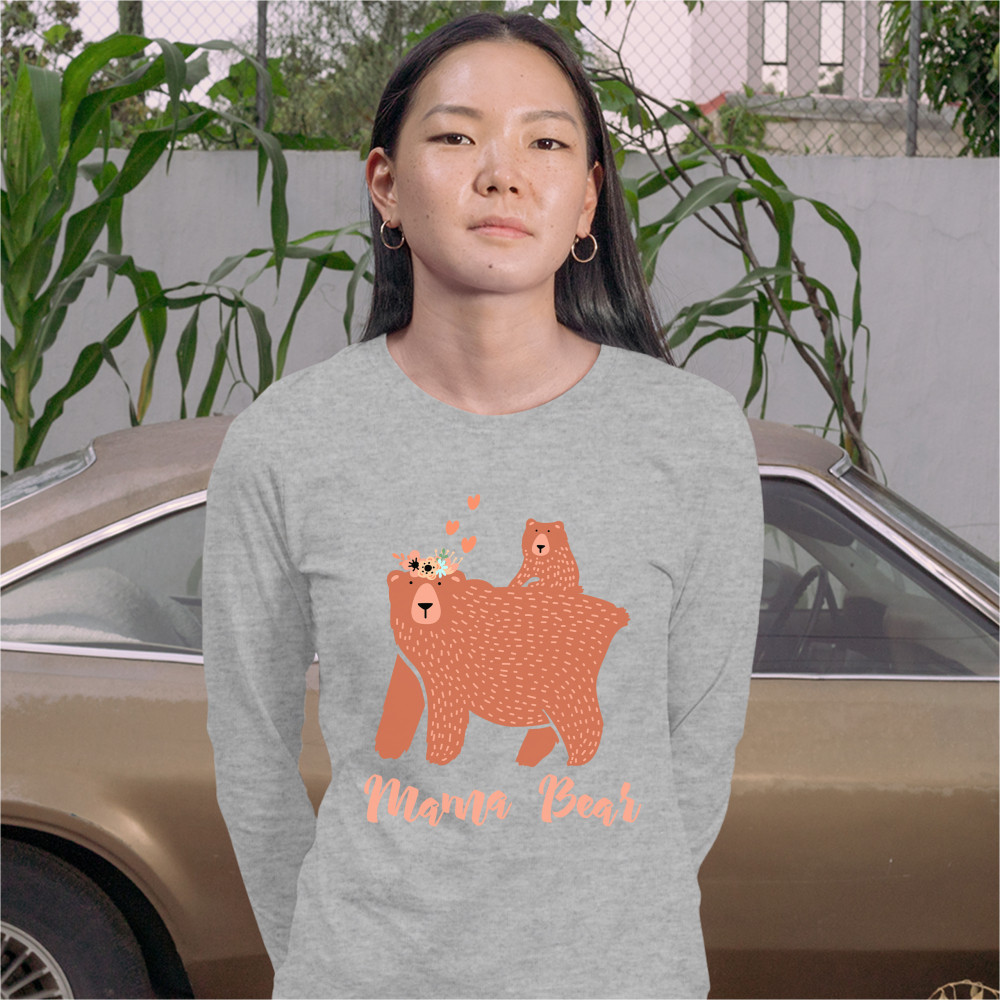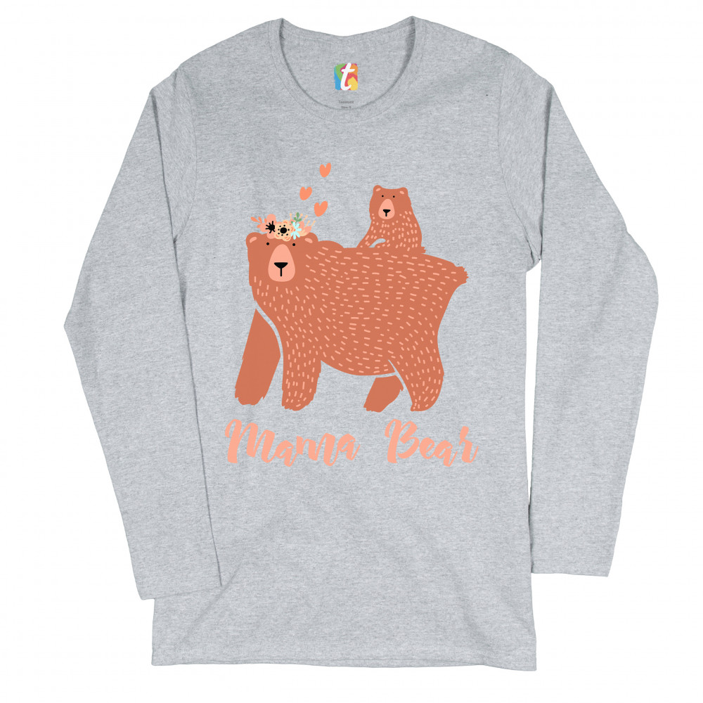 A beautiful print featuring a sweet momma bear caring a cub on her back. She is wearing a crown of flowers on her head with several hearts floating above it. Underneath her it says: "Mama Bear". A great choice as a gift on Mother's Day for a loving caring mom.