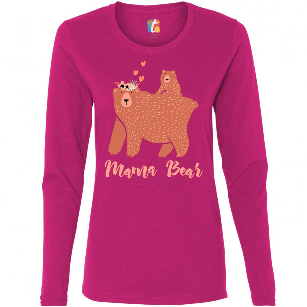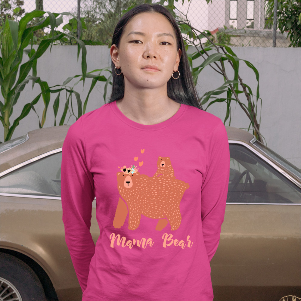 A beautiful print featuring a sweet momma bear caring a cub on her back. She is wearing a crown of flowers on her head with several hearts floating above it. Underneath her it says: "Mama Bear". A great choice as a gift on Mother's Day for a loving caring mom.