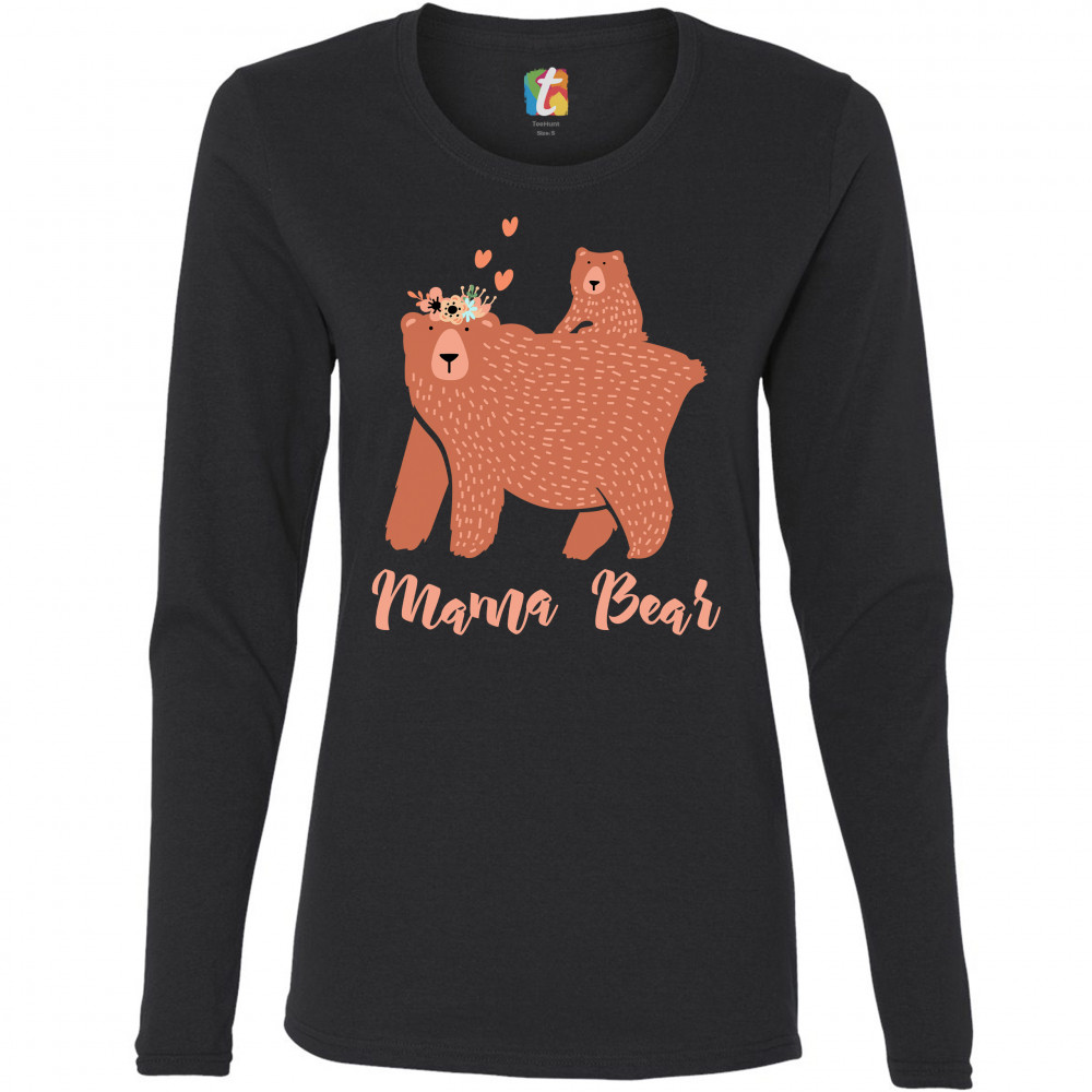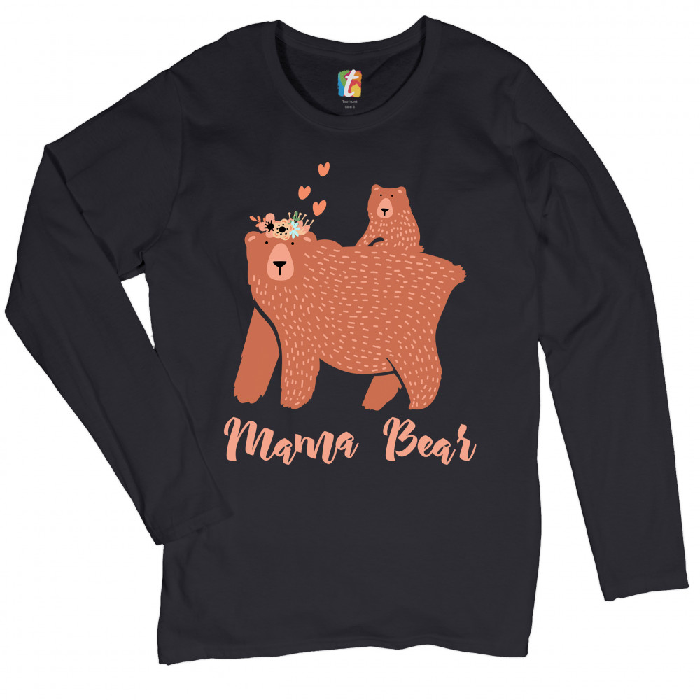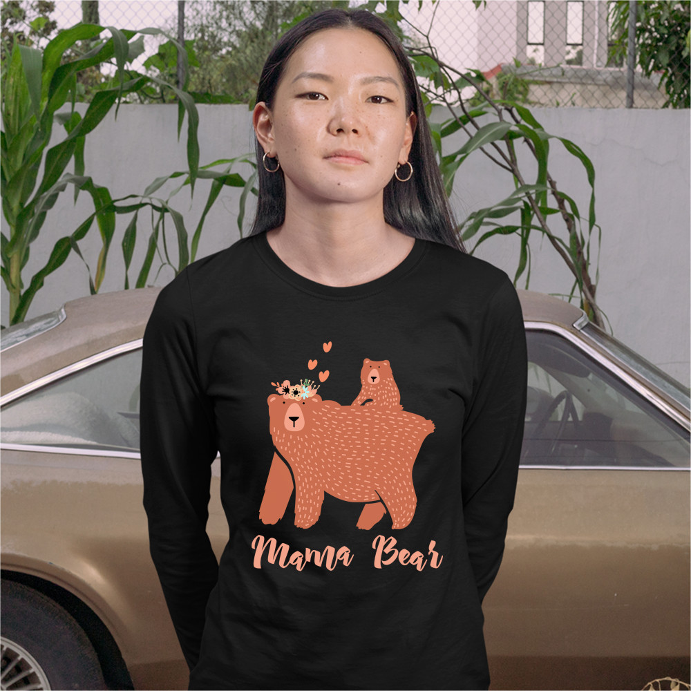 A beautiful print featuring a sweet momma bear caring a cub on her back. She is wearing a crown of flowers on her head with several hearts floating above it. Underneath her it says: "Mama Bear". A great choice as a gift on Mother's Day for a loving caring mom.