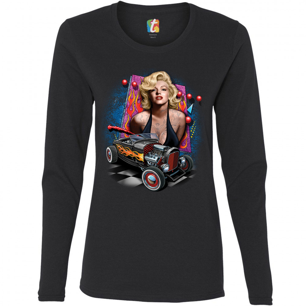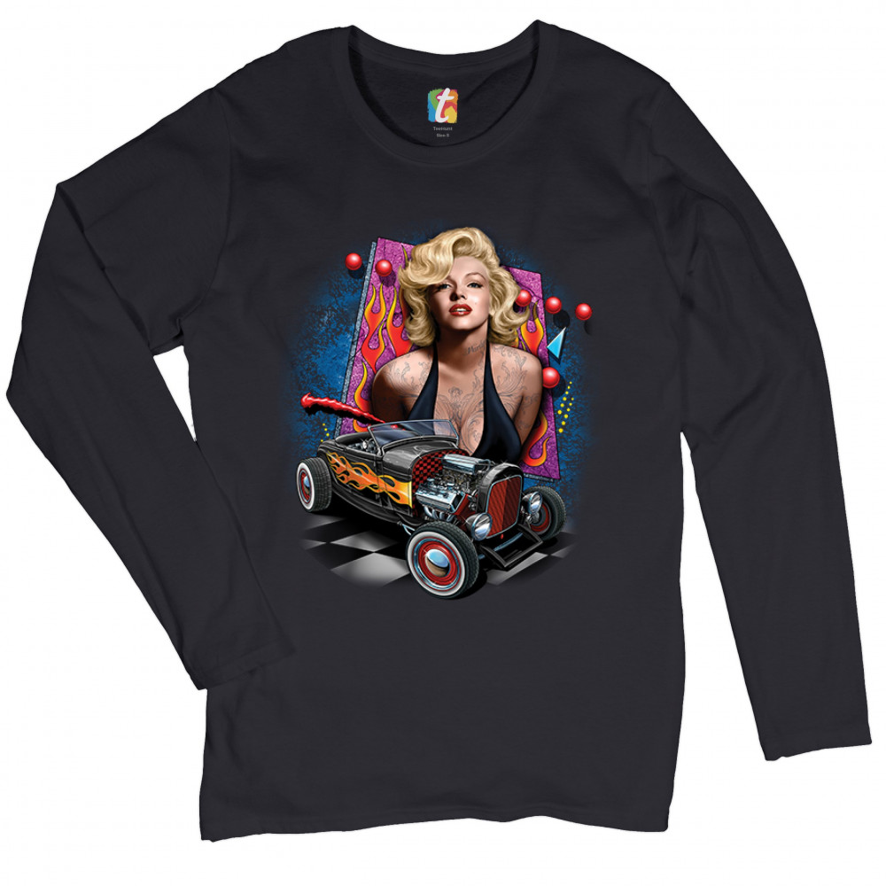 MARILYN MONROE HOT ROD women's long sleeve t-shirt vintage route 66 drag racing black