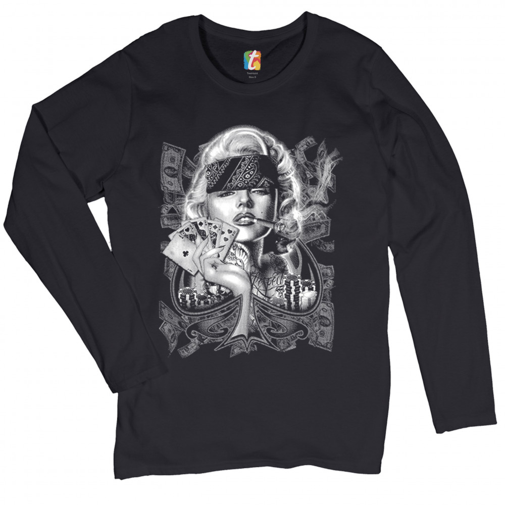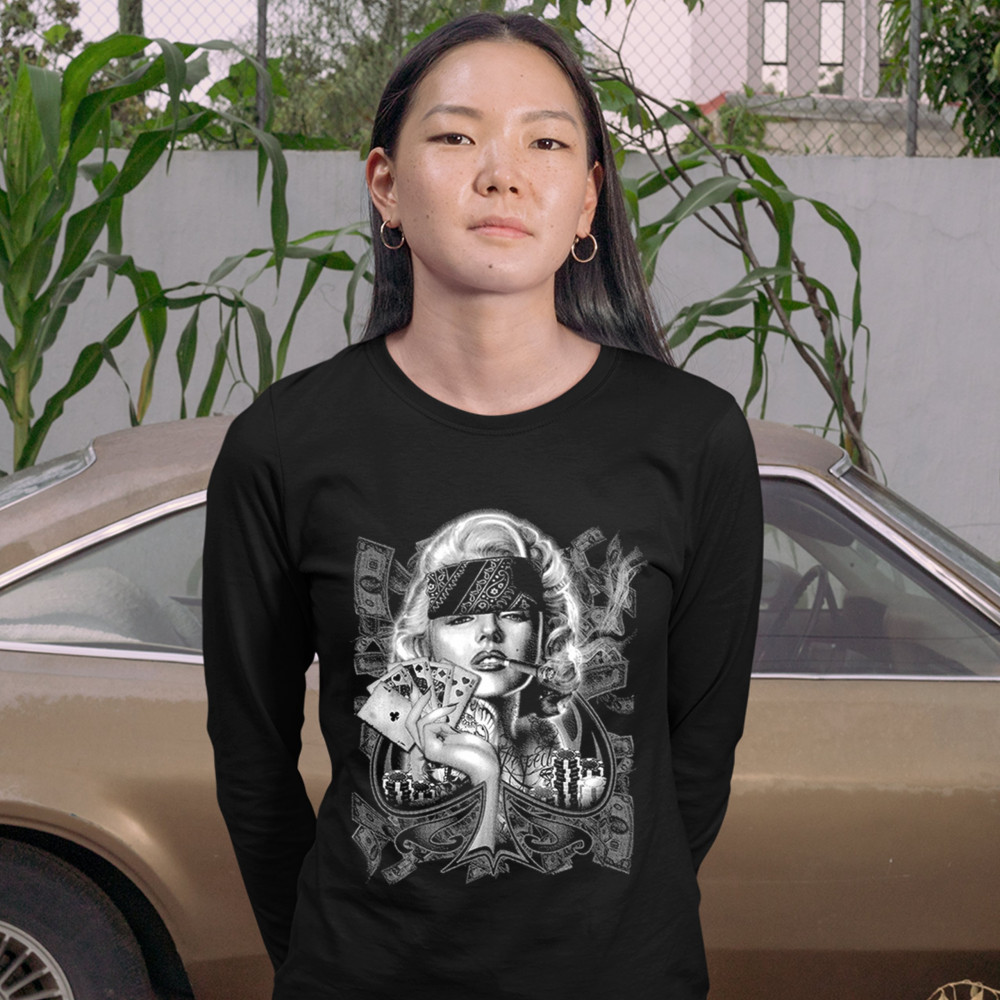 MARILYN MONROE PLAYING POKER SMOKING A JOINT women's long sleeve t-shirt 420 black