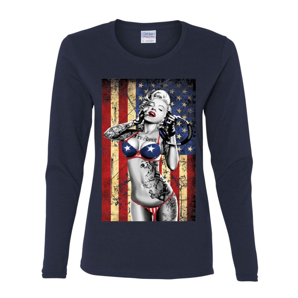 SEXY MARILYN MONROE US FLAG marilyn monroe us flag women's long sleeve tee freedom sexy girl tattoos gangsta navy blue