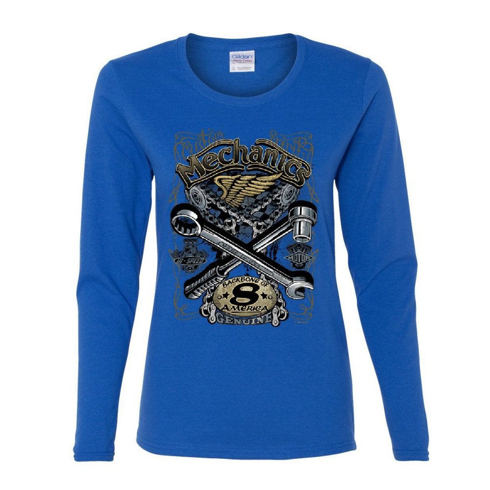 MECHANICS - BACKBONE OF AMERICA mechanics backbone of america women's long sleeve tee engine repair blue collar royal blue