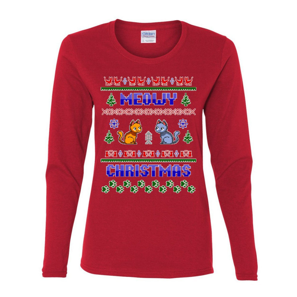 MEOWY CHRISTMAS UGLY SWEATER women's long sleeve tee cat kitten purr merry xmas red