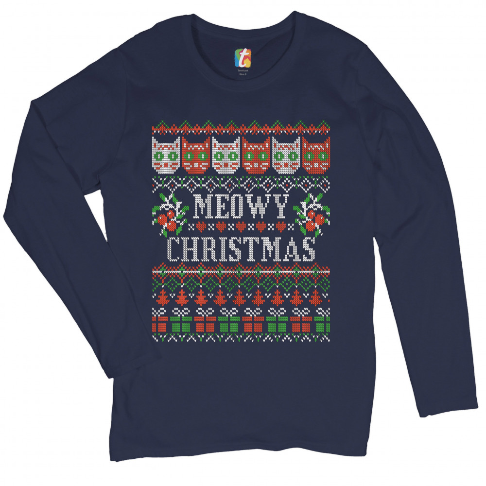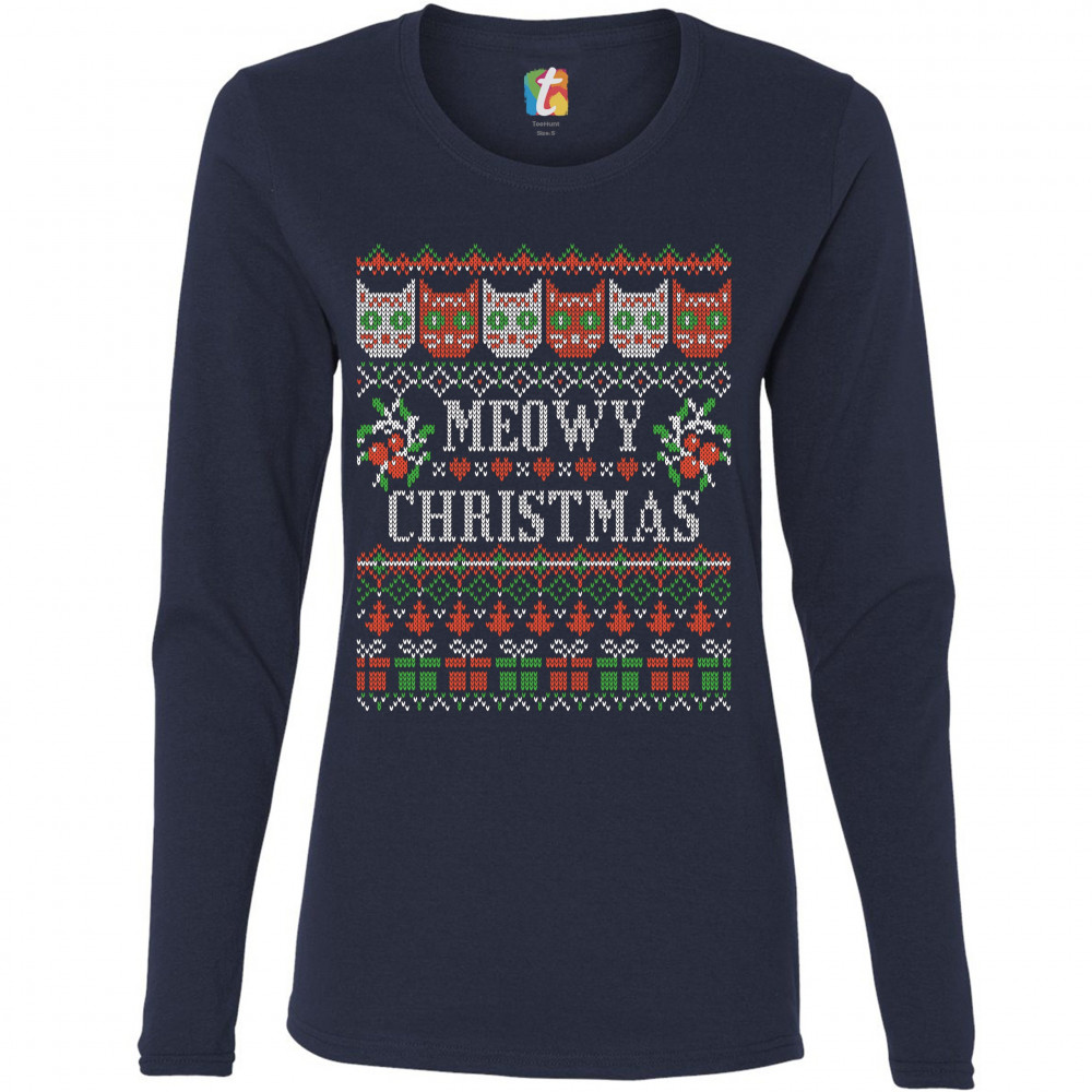 MEOWY CHRISTMAS women's long sleeve t-shirt ugly sweater cat lover funny xmas navy blue