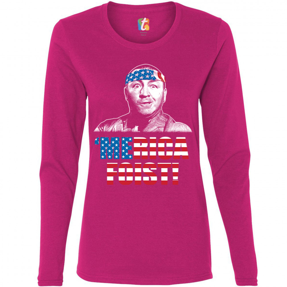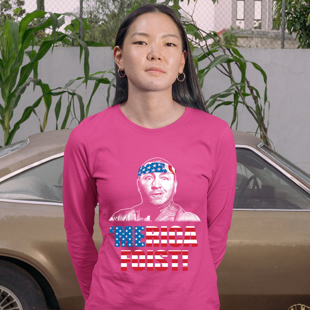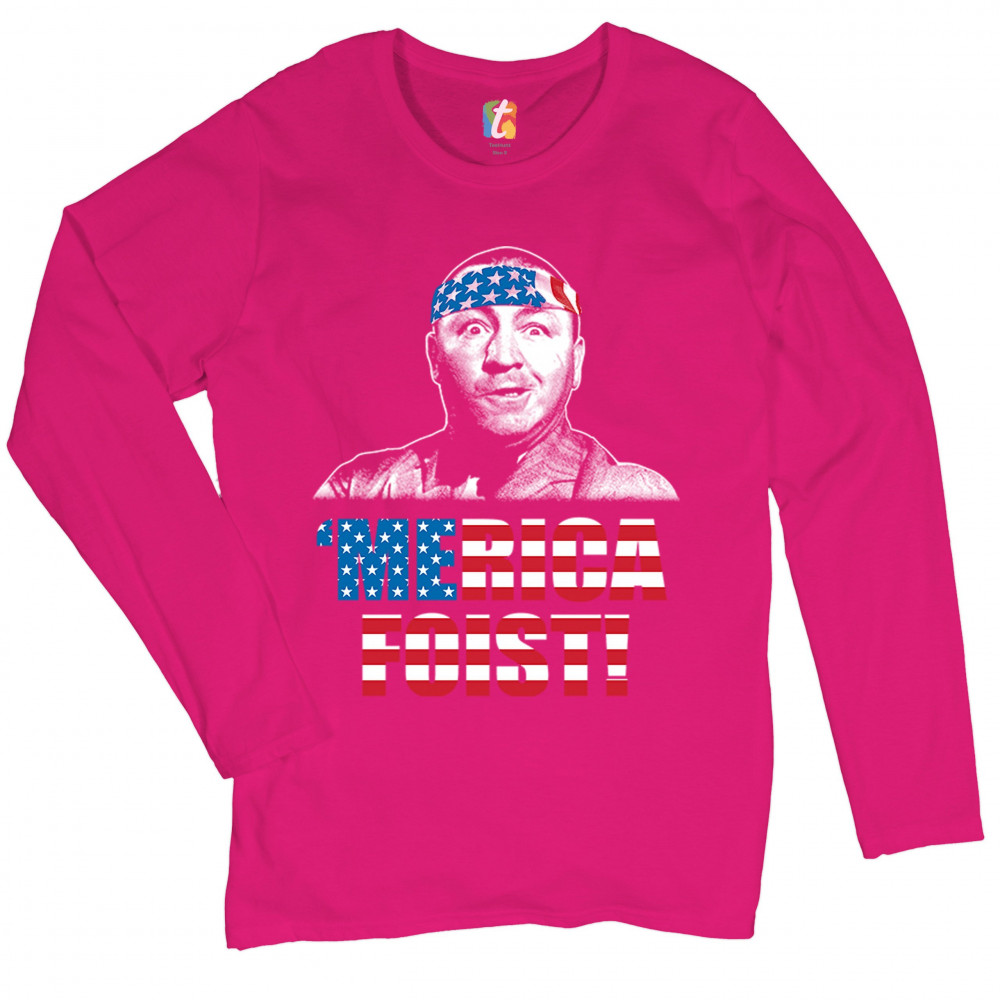 A funny patriotic print saying: "'Merica Foist" and depicting grinning Curly Howard wearing an American flag bandana. The words are decorated with the Stars and Stripes of the American flag. A great gift for anyone who is a fan of the legendary TV show.