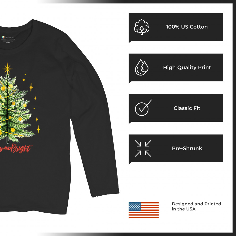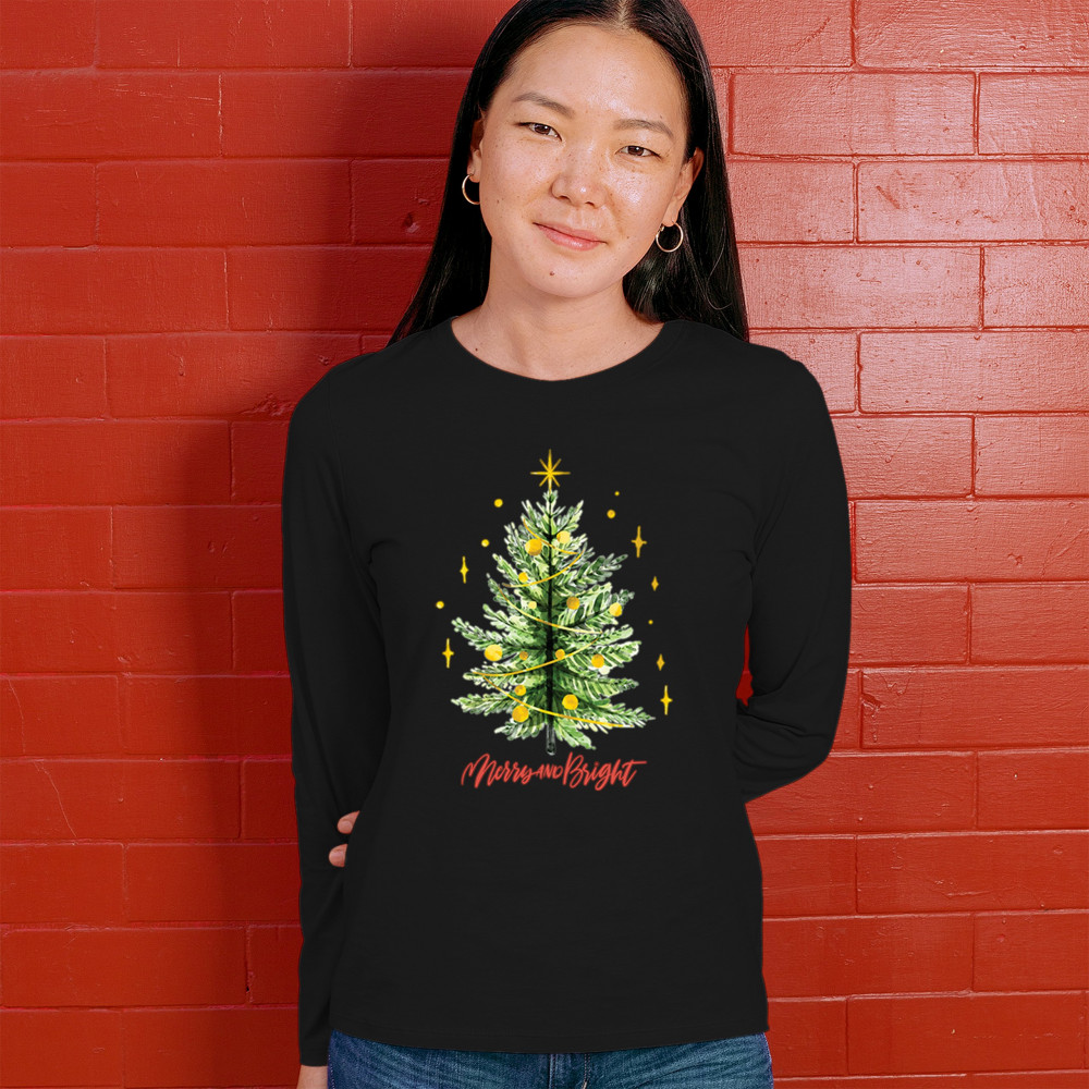Festive “Merry and Bright†shirt featuring a joyful Christmas tree. Perfect for holiday gatherings, office parties, or Secret Santa gifts.
