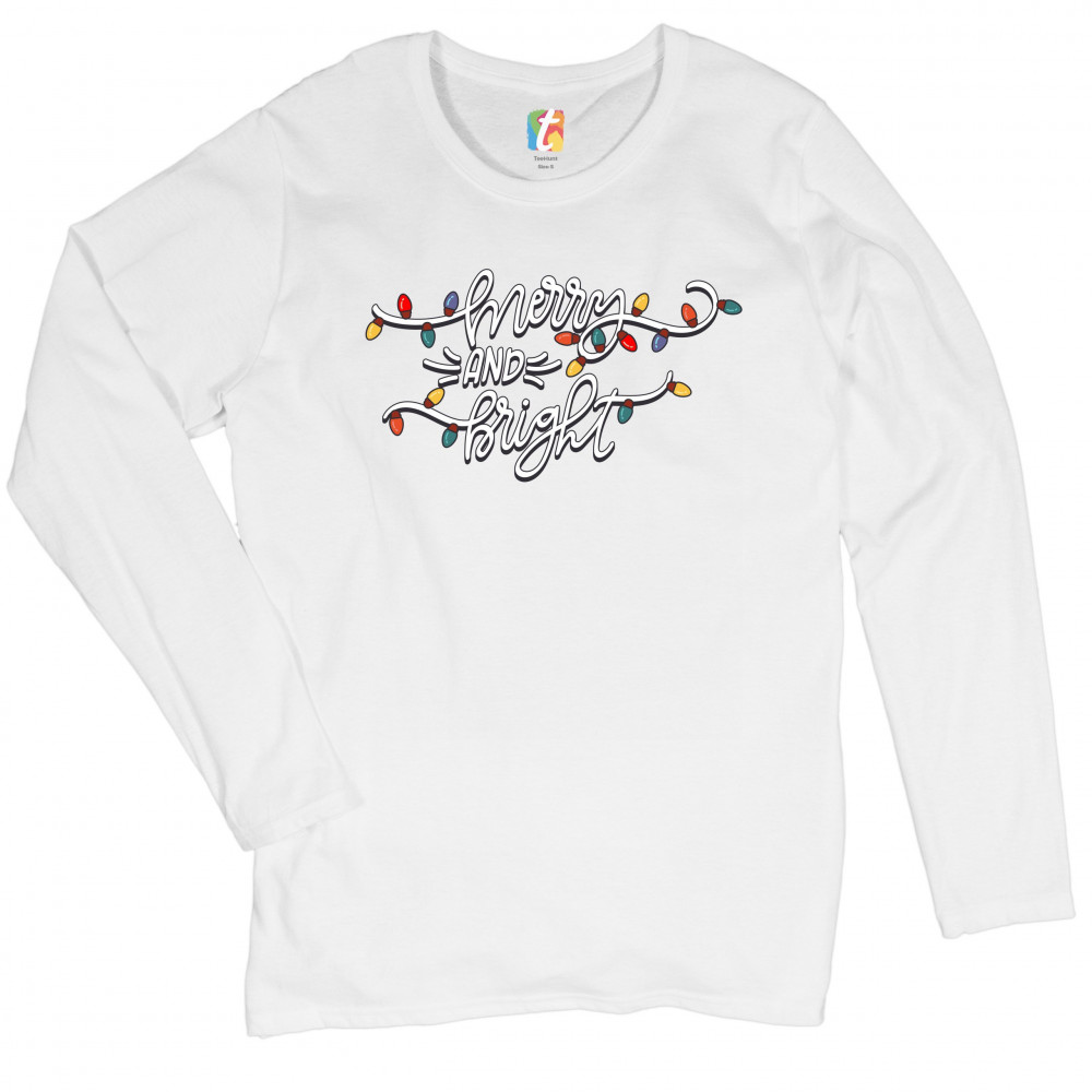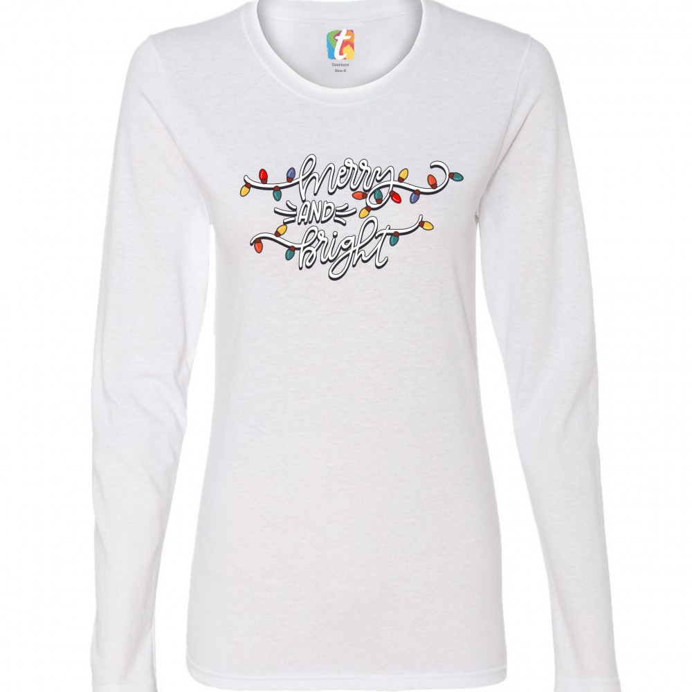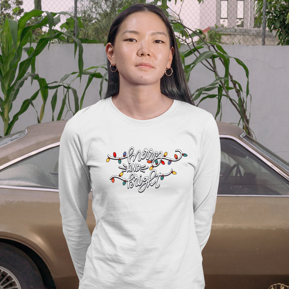 MERRY AND BRIGHT women's long sleeve t-shirt christmas eve holiday spirit white