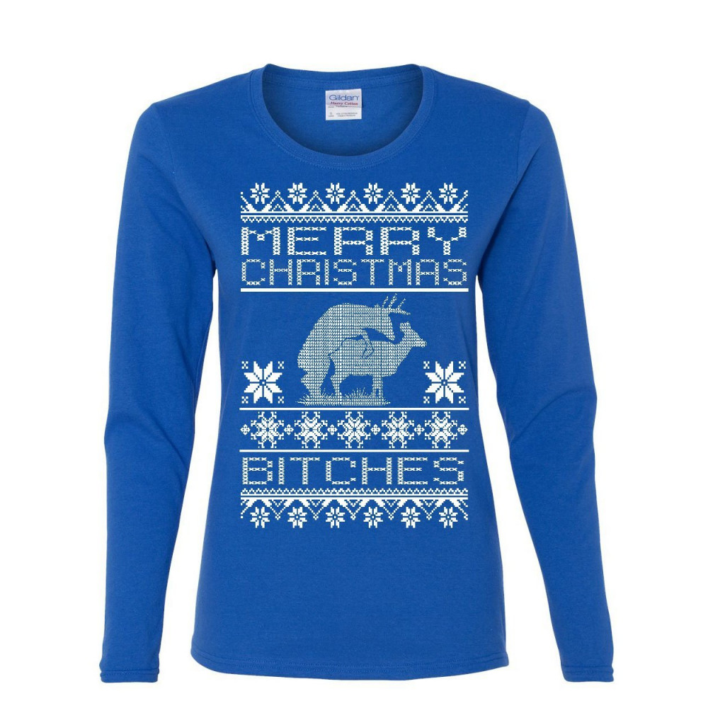 MERRY CHRISTMAS BITCHES women's long sleeve t-shirt deer humping ugly sweatshirt royal blue